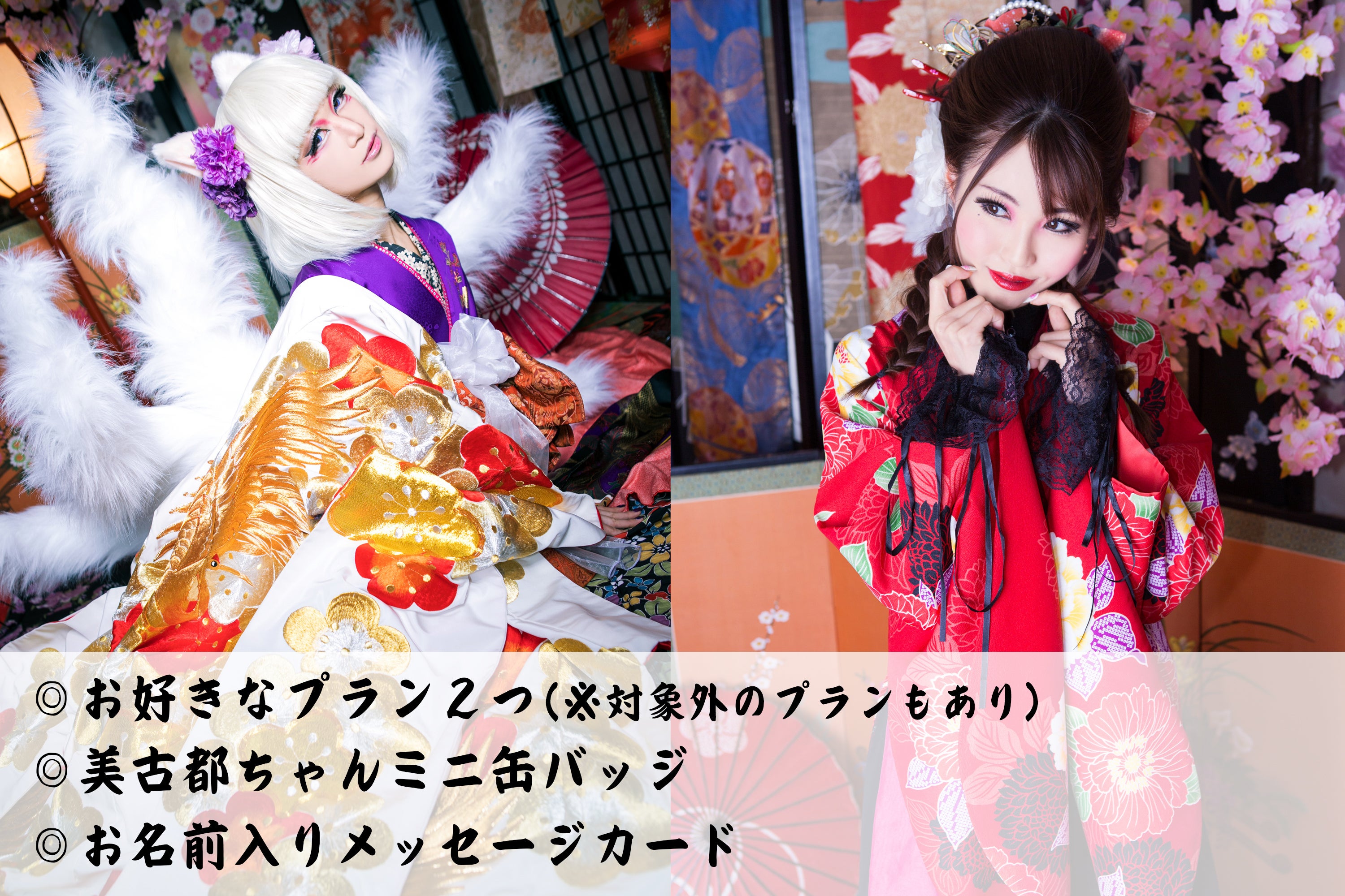 当店のプランの中からお好きなものを2つ体験できるギフト券・美古都ちゃんミニ缶バッジ・お名前入りメッセージカードの3点にお礼の手紙を添えてお送り致します。