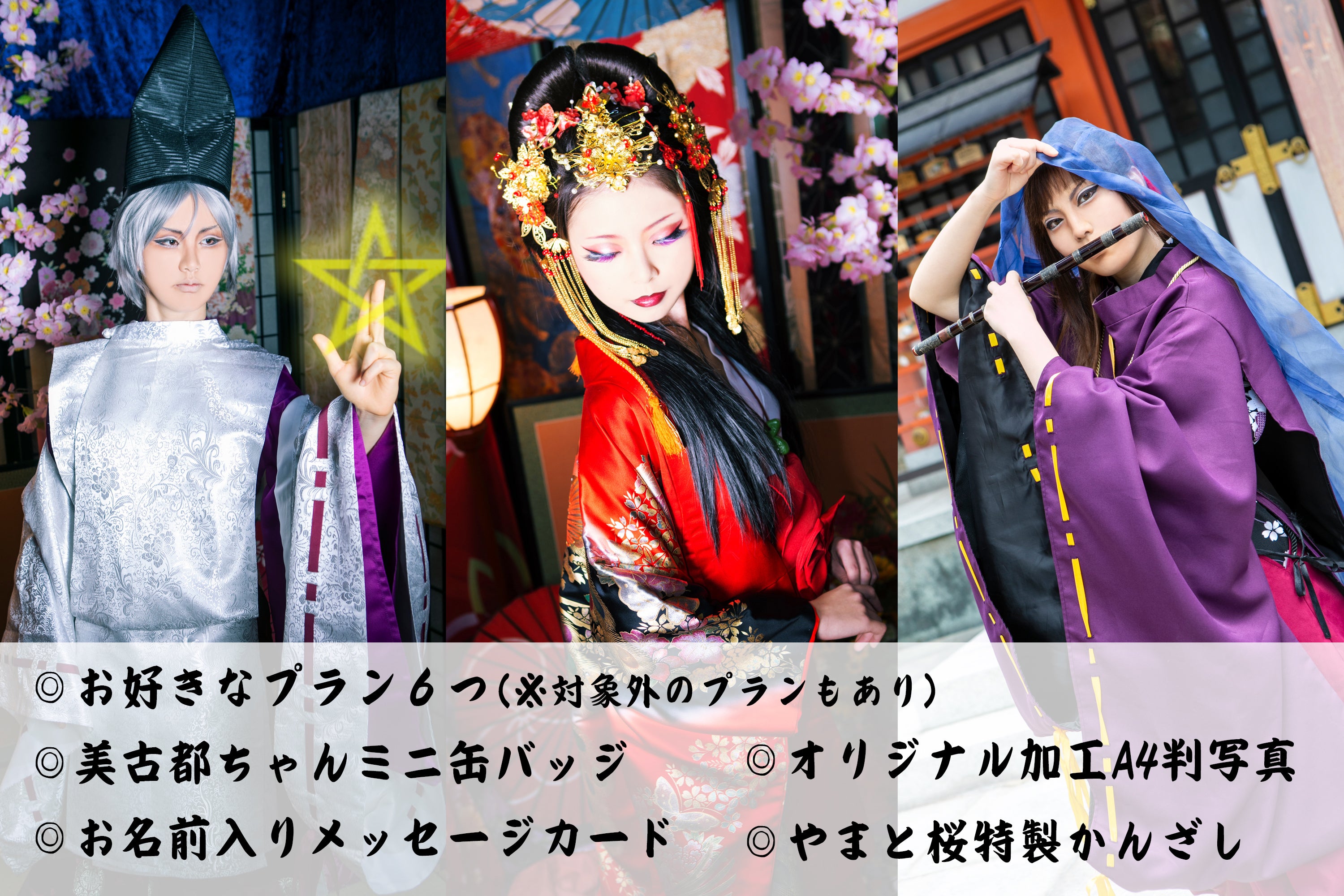 当店のプランの中からお好きなものを6つ体験できるギフト券・美古都ちゃんミニ缶バッジ・お名前入りメッセージカード・オリジナル加工A4判写真・やまと桜特製かんざしの5点にお礼の手紙を添えてお送り致します。