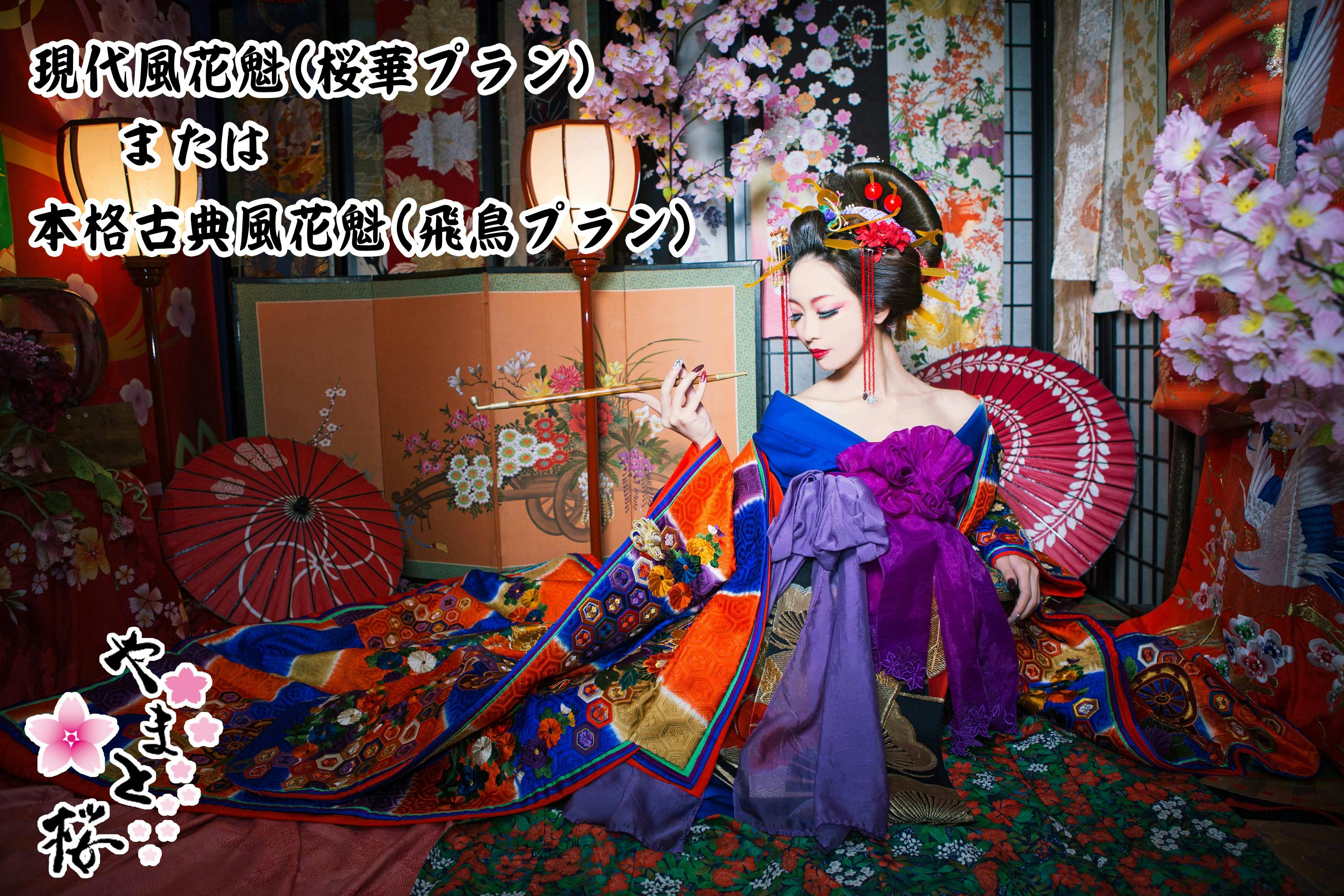 ウィッグや花飾りなどを使って華やかに仕上げる現代風花魁か、伊達兵庫髷と花魁かんざしを使った古典風ヘアスタイルに仕上げる本格古典風花魁のどちらかお好きな方をご体験いただけます。