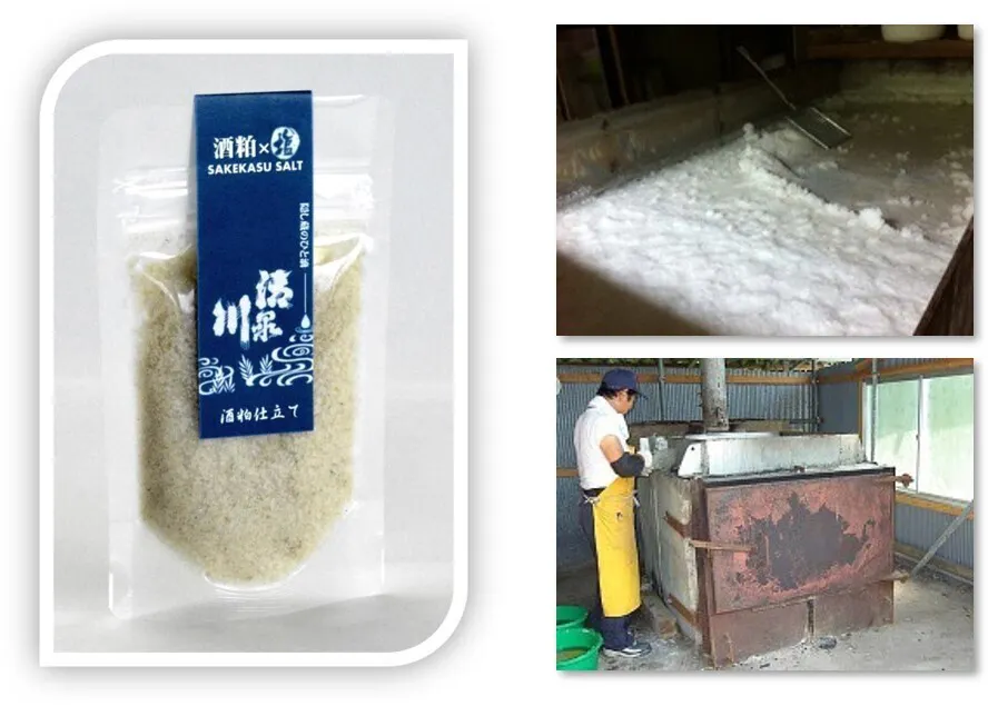 今回はこの「さかたの塩」とのコラボにより、当酒蔵のハープ入り酒粕を使用したオリジナルの酒粕仕立ての塩を造りました。