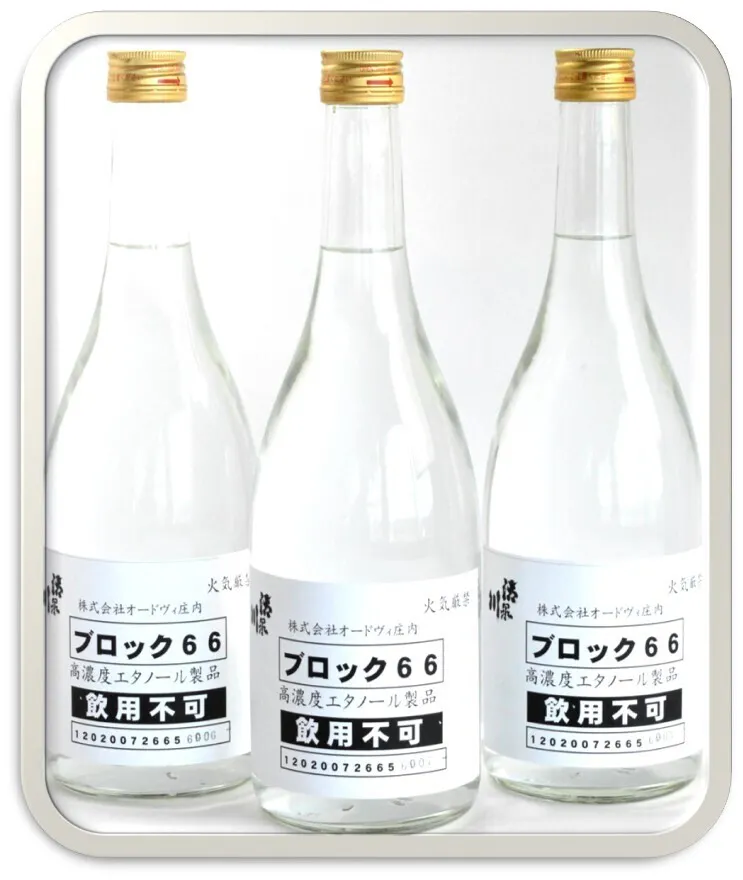 このセットには、酒蔵が製造した高濃度エタノール消毒液ブロック66/720ml・1本をお付け致します