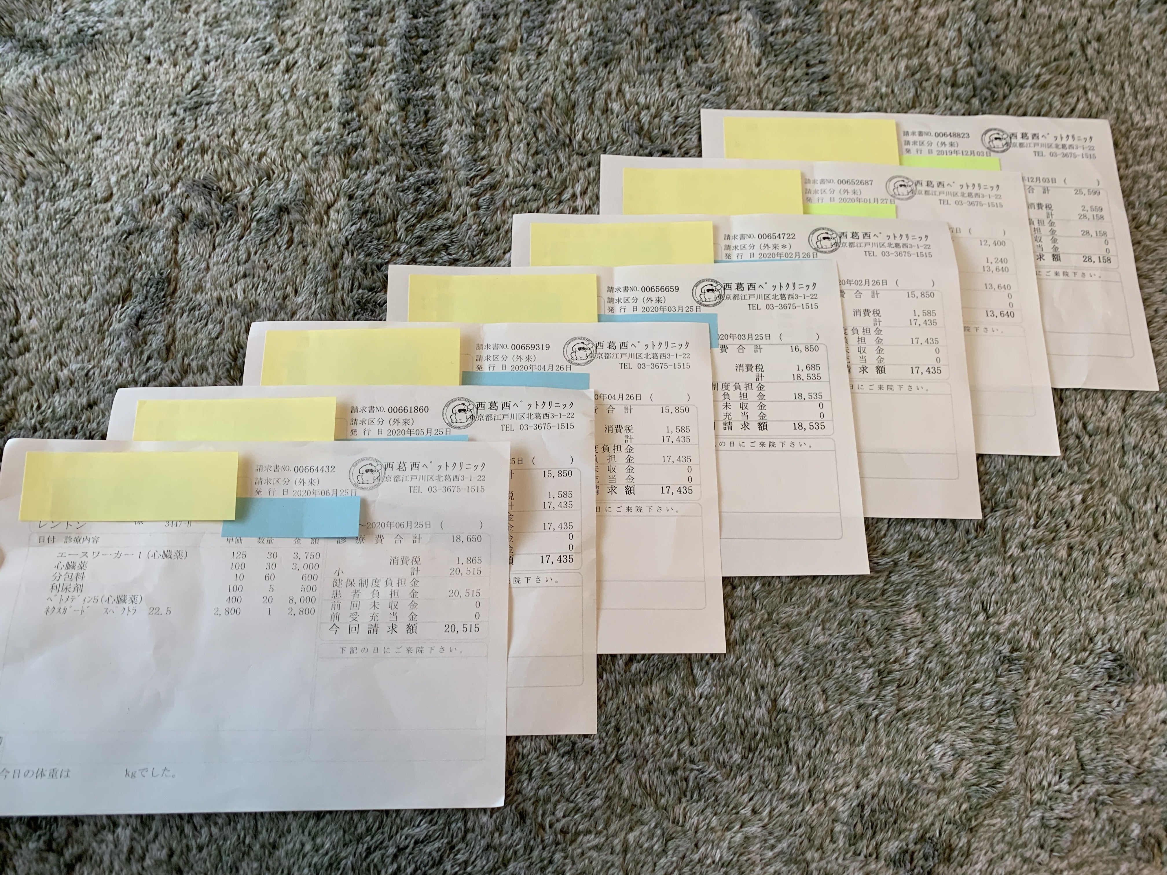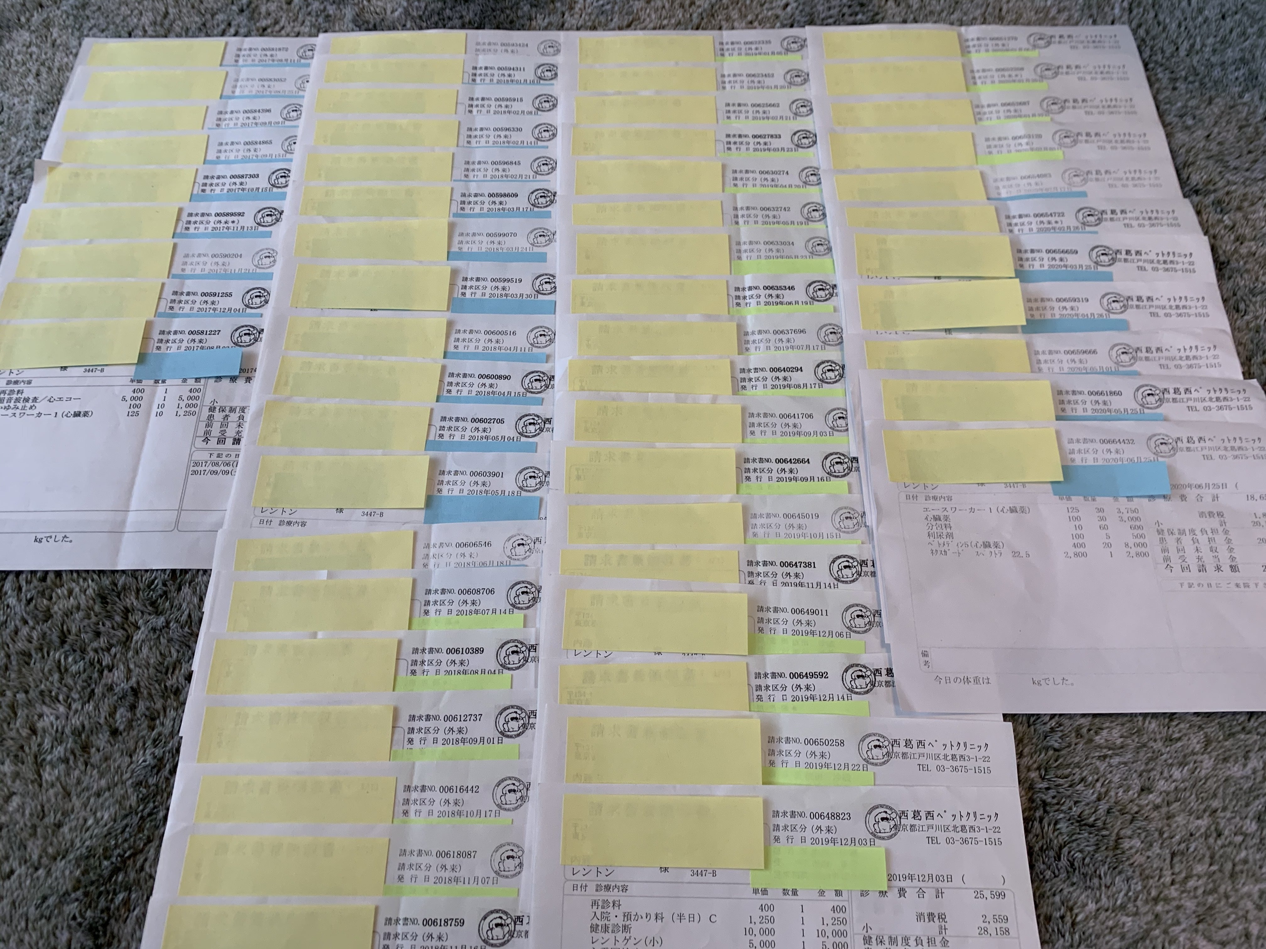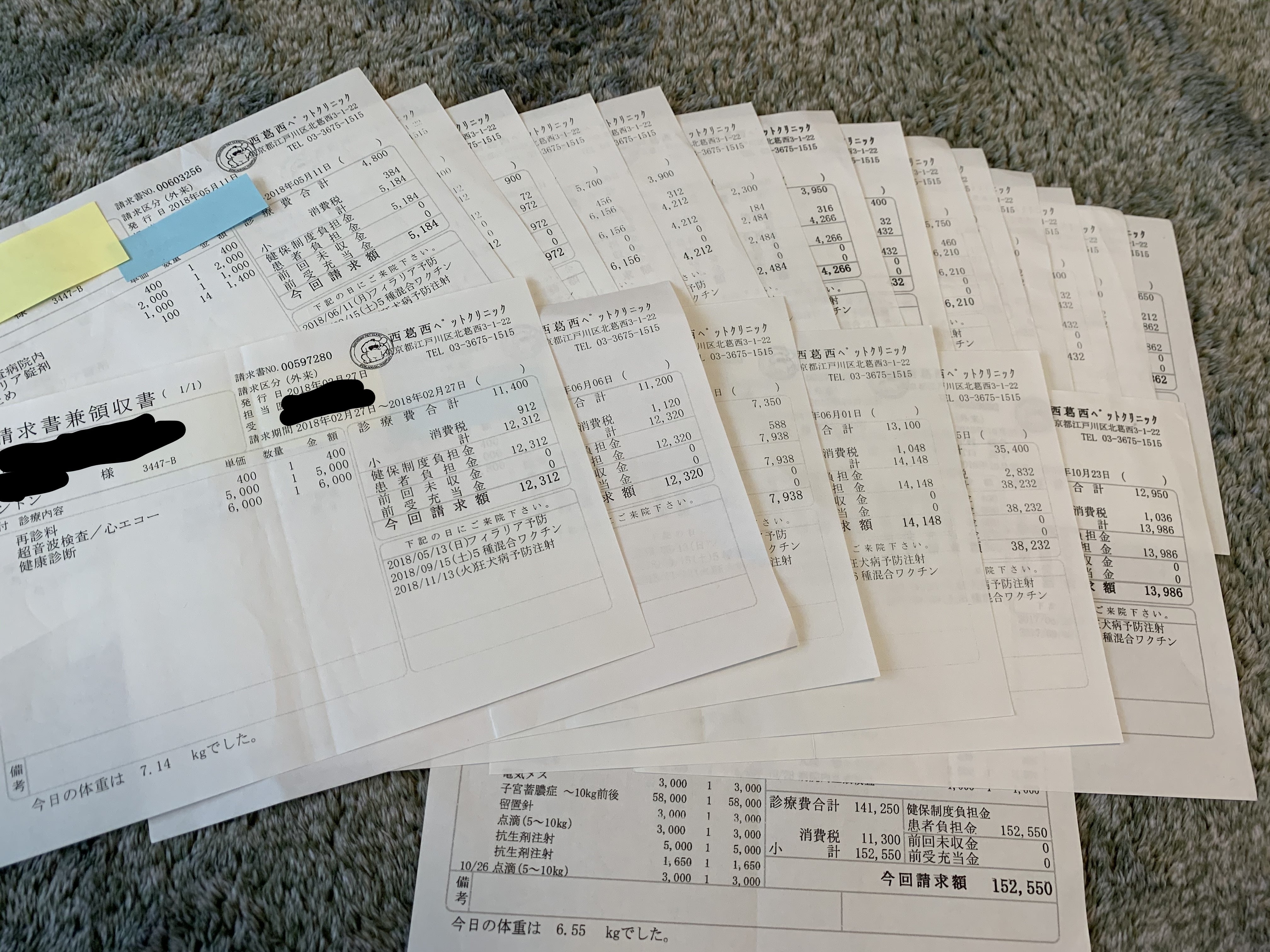 これまでに治療費や診察費、お薬に掛かった費用になります。(請求書兼領収書の全ては重複したものはありません。また、個人情報が多く記載されている領収書のため少し伏せさてていただきました。)