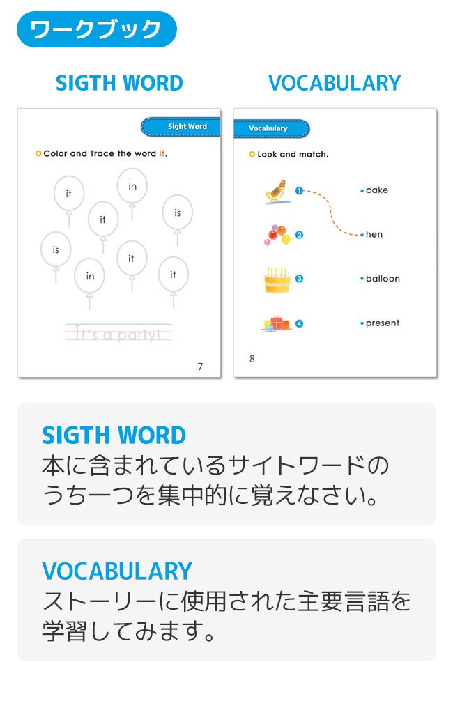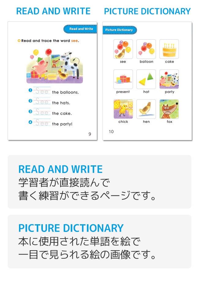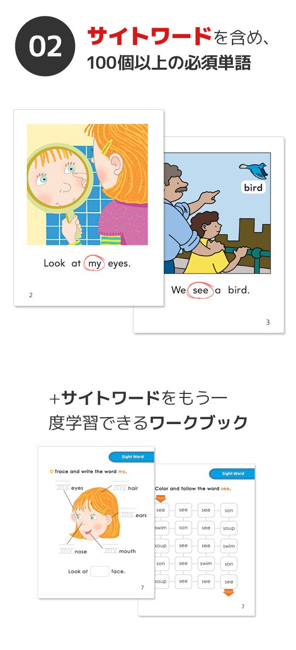 言い換えるとHIGH FREQUENCY WORDS(頻出ワード)、すなわち、子どもの本の50%~70%を占める出現頻度の高い単語で、見る途端、一目ですぐに読まなければならない重要な単語です。