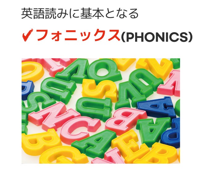 幼児、小学校英語教育で扱うアルファベット文字が出す音を学ぶのです。