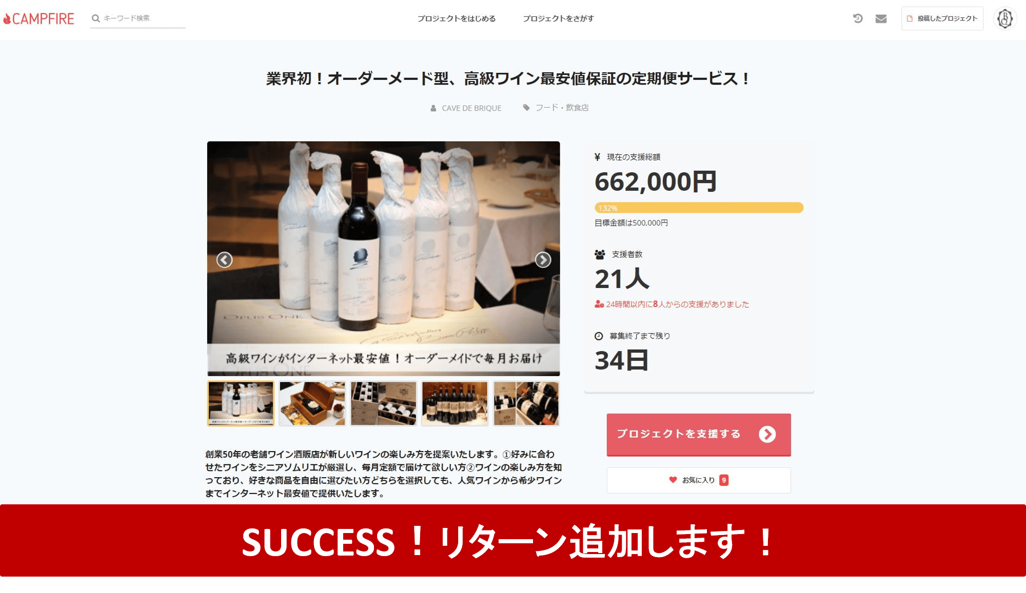 2020/08/25 15:45プロジェクト公開から3日で目標であった50万円を達成することができました。ご支援いただいた皆様、本サービスに関係していただいた皆様、誠にありがとうございます!当社自慢のお得なワインの到着を、今しばらくお待ちいただけますと幸いです。正式なご連絡はプロジェクトの終了後に申し上げます。(CAMPFIREの仕組み上終了後でないと不可な為です。お時間頂戴し申し訳ありません。)お任せコースのお客様はシニアソムリエが厳選したワイン、オーダーメイドプランのお客様はワインリスト送付後にワインをチョイス&順次発送してまいります。さて今後の取り組みとしては、Out Of Stockとなったリターンを追加募集させていただきます。(条件が当初より異なります、ご注意くださいませ。)また、プロジェクト終了後のワイン発送に向けて良い準備をしてまいります。そしてさらに本プロジェクトを盛り上げるよう様々な施策や報告も行う予定ですので、引き続きCAMPFIREにて本プロジェクトを宜しくお願い申し上げます。 もっと見る