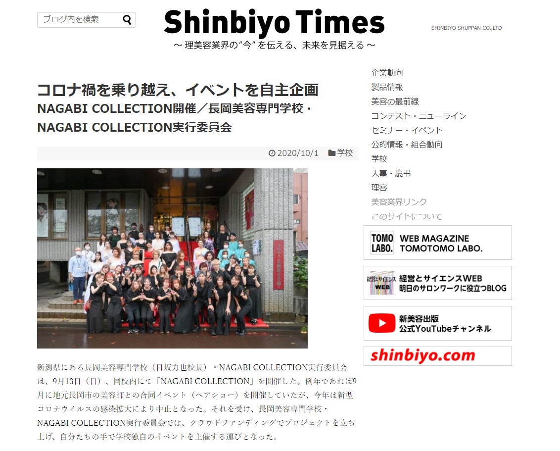 2020/10/01 19:40去る9月13日、雨が降る中、開催したNAGABI COLLECTION。皆さまからの応援・ご支援のおかげで無事に終えることができました...ありがとうございました。このNAGABI COLLECTIONを、美容業界誌を数多く出版されている「新美容出版」のホームページに掲載されました。コンテスト部門・入賞者の作品とコメントも紹介されていますので、ぜひご覧ください!新美容出版 https://www.shinbiyo.com/sj/?p=8832 もっと見る