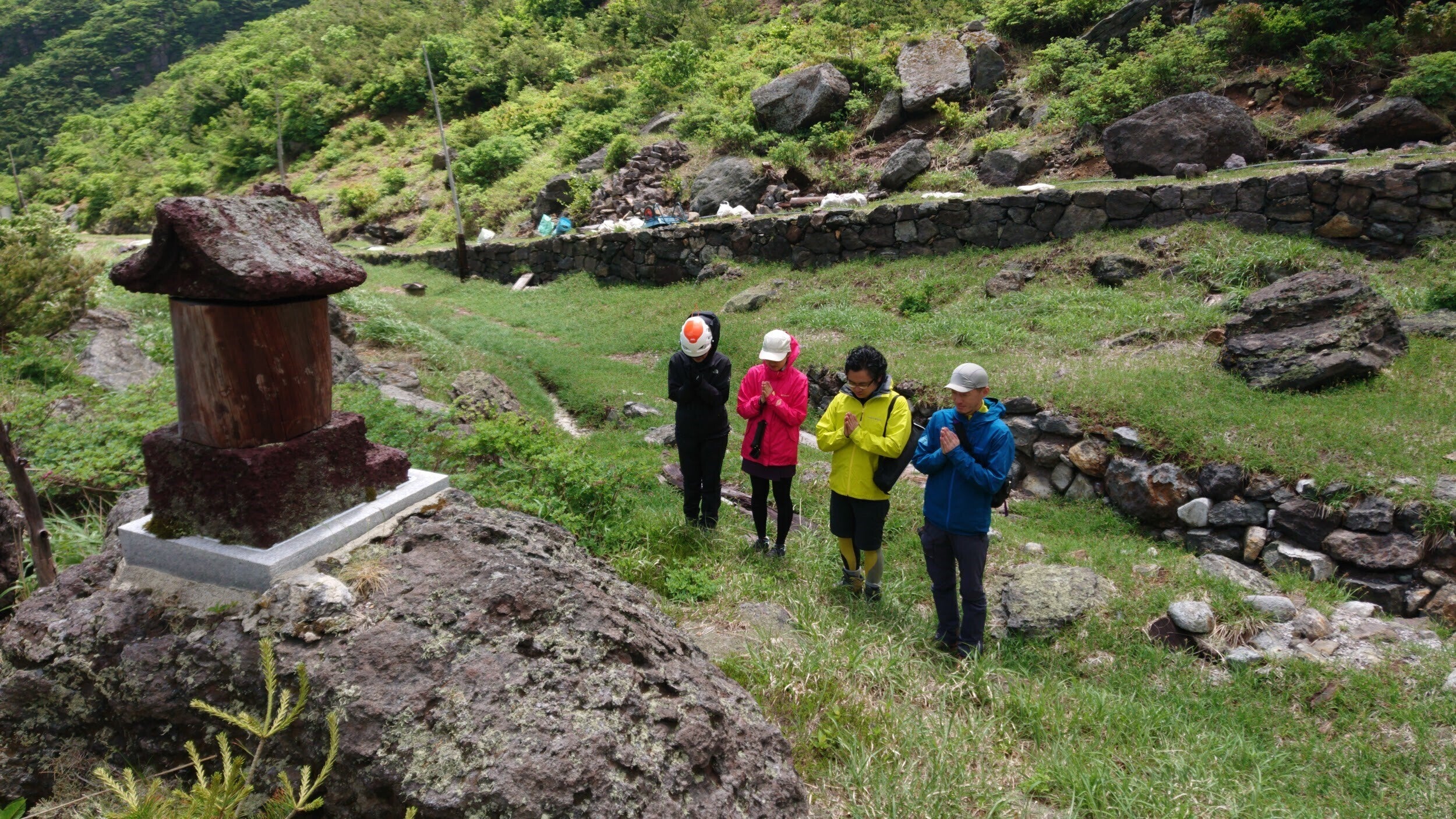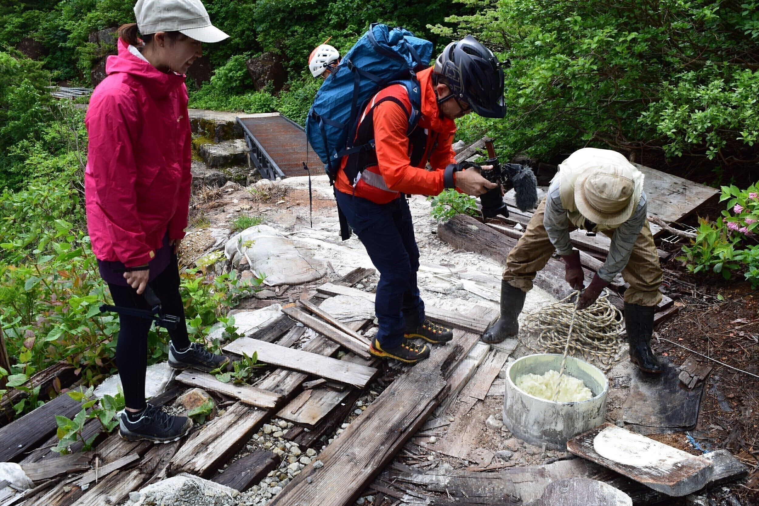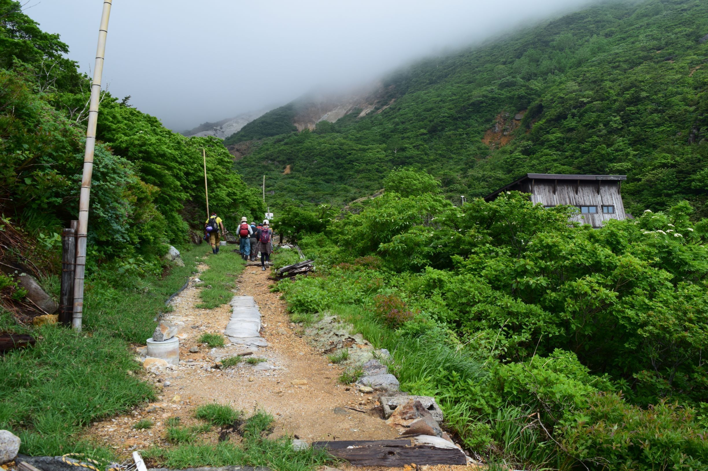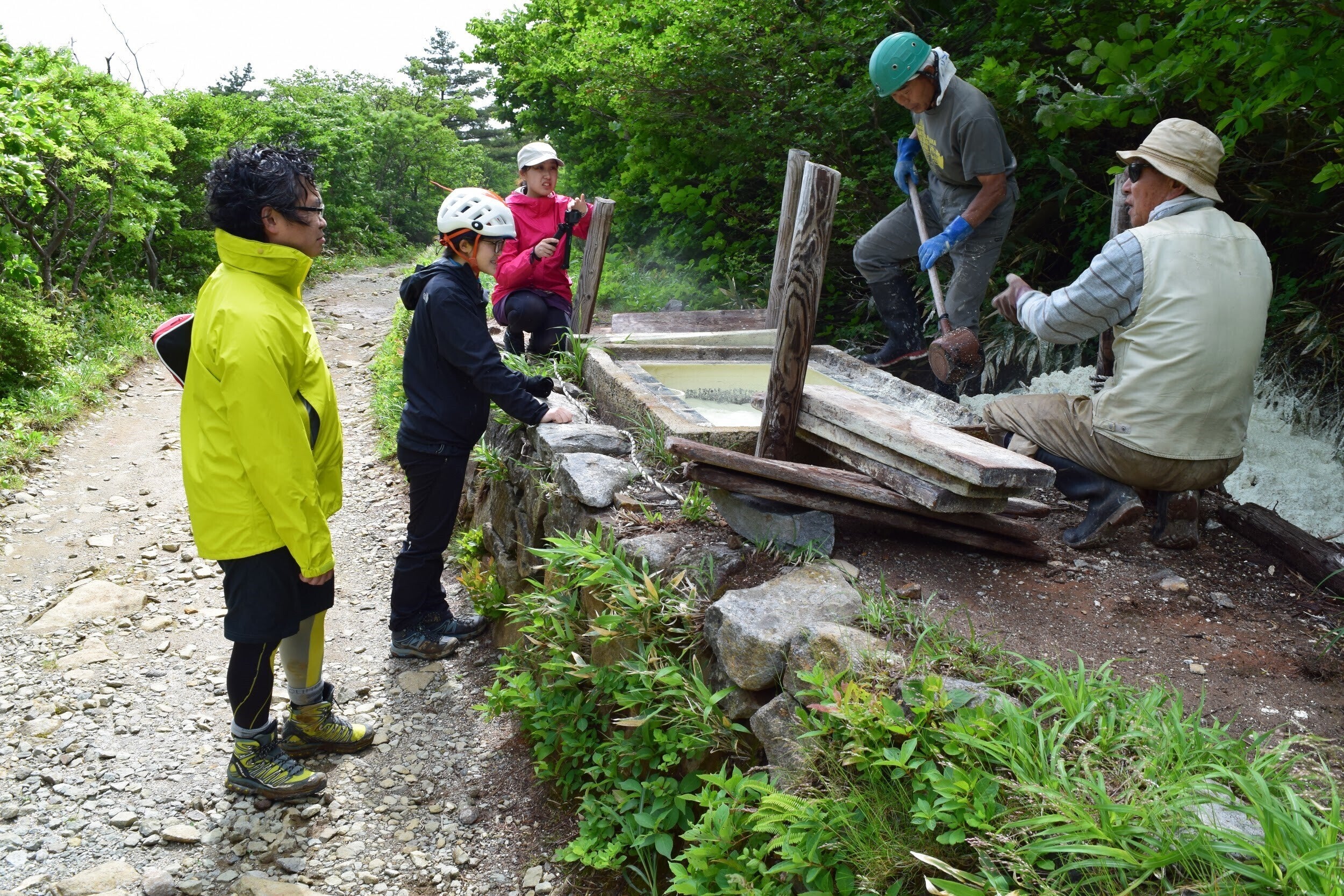 重機も入れない源泉付近では手作業で湯守の作業が行われております。