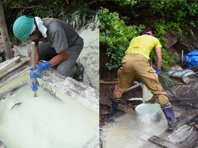 夏の湯花流しは暑さとの戦い炎天下でも真冬でも、この作業を欠かすわけにはいきません。