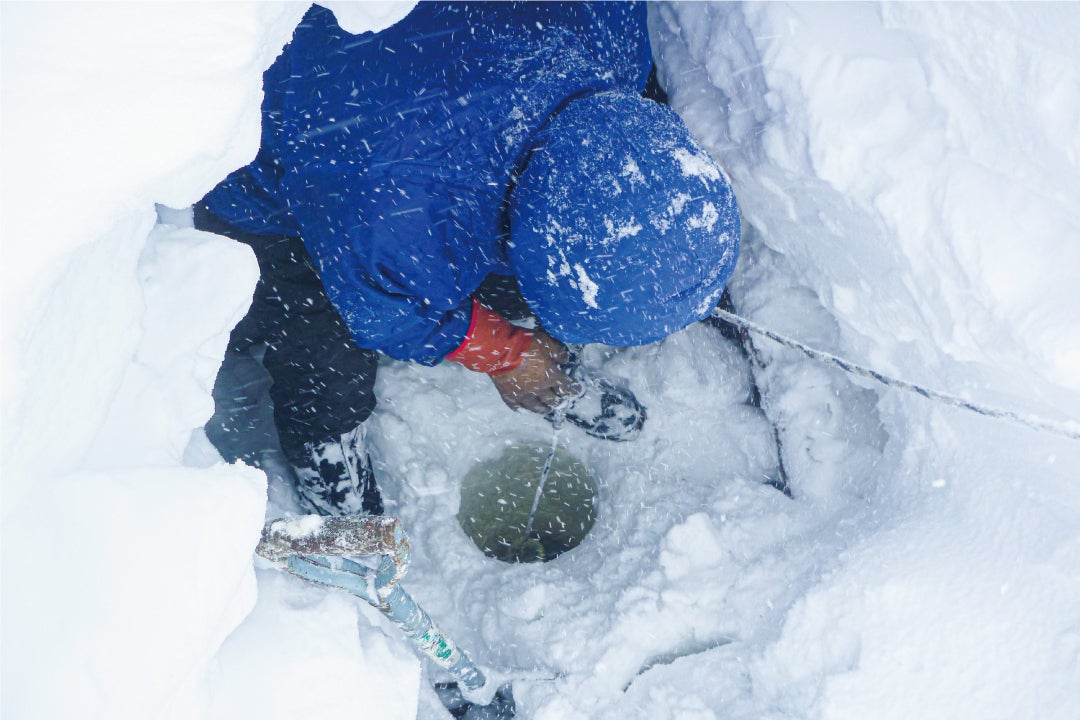 冬の源泉地帯を歩く湯守更に、目印として立てた6メートルの竹棒だけを頼りに源泉や点検口を掘り出す作業があり、ひとつ掘るのに1時間かかるだけでも過酷な上、雪の穴の中に硫化水素ガスが溜まってしまうため、一歩間違うと命に関わる危険が伴う作業となります。
