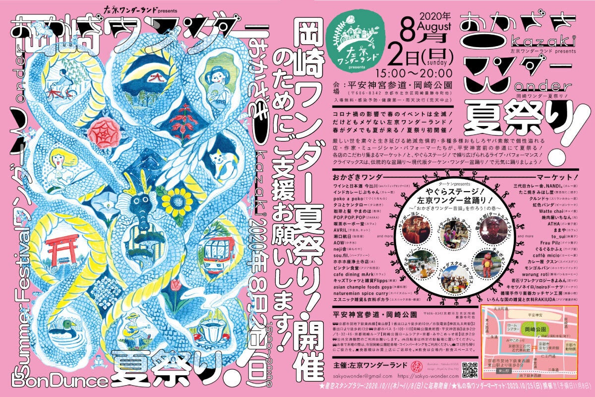2020年8月2日(日)15:00〜20:00 平安神宮前の参道(岡崎公園)で開催予定の【岡崎ワンダー夏祭り!】の運営費として活用させていただきます。