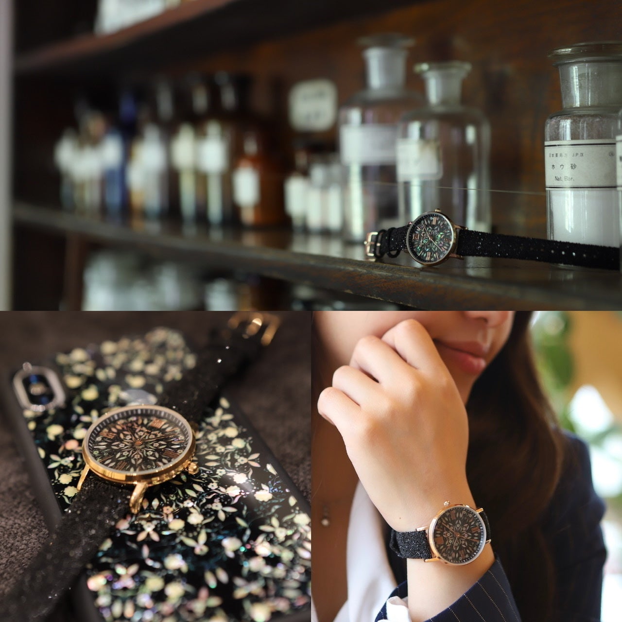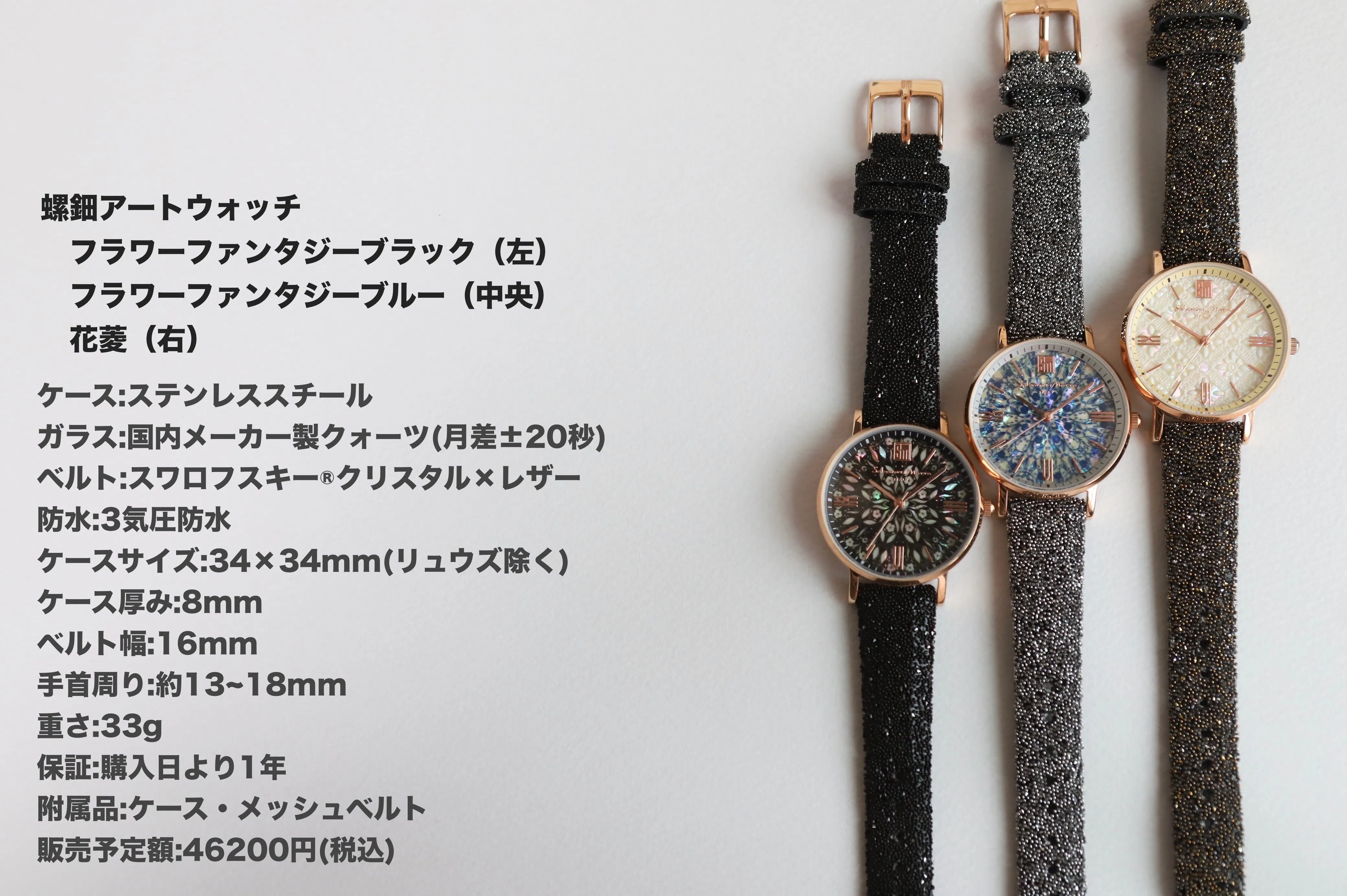 ①螺鈿アートウォッチ35%OFF 46,200円→30,030円 フラワーファンタジー ライト/フラワーファンタジーブラック/花菱各10点