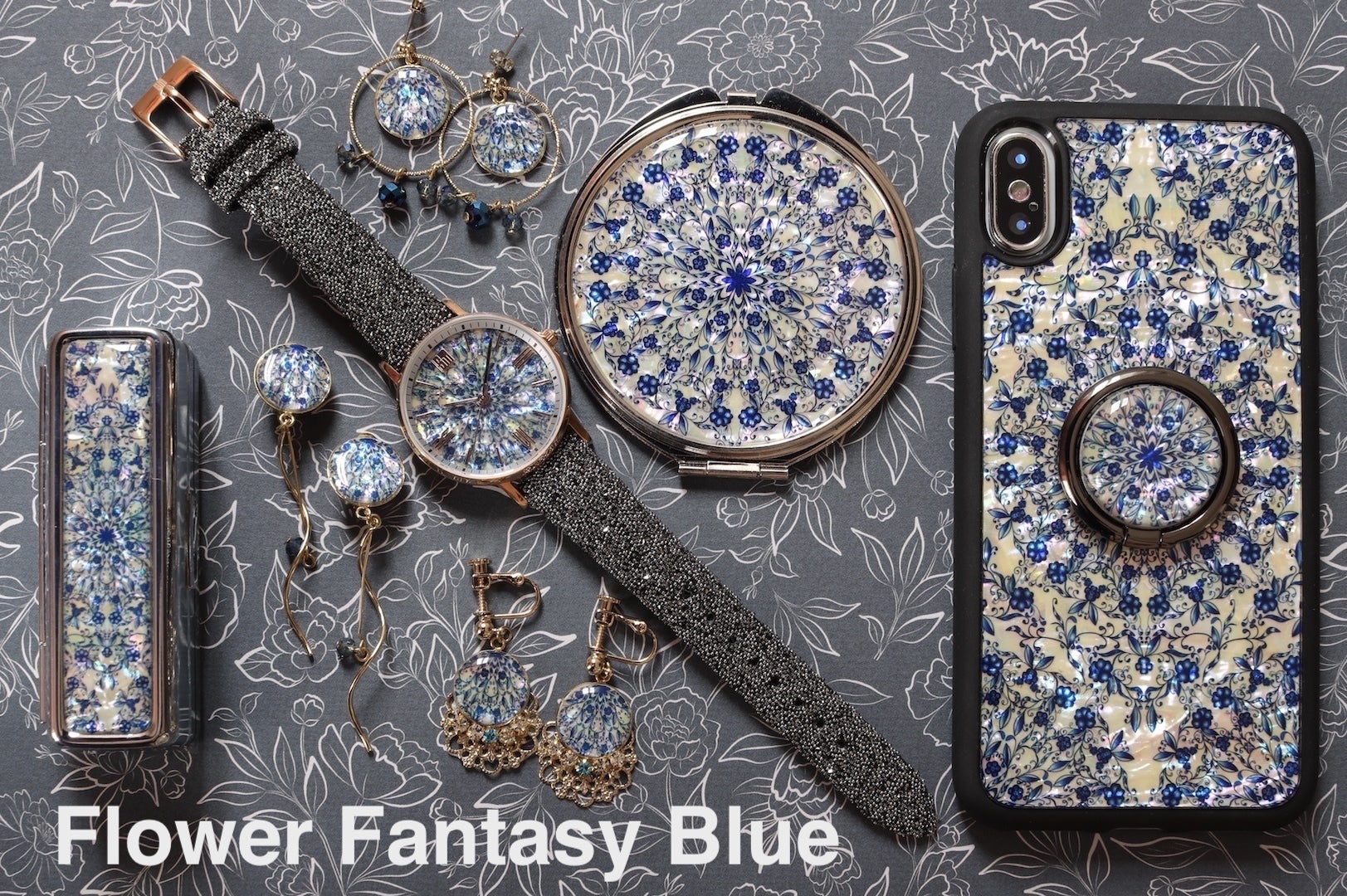 ⑤フラワーファンタジーライトセット 79,880円→52,000円(約35%OFF) フラワーファンタジーライトデザイン 腕時計・スマホケース・スマホリング・コンパクトミラー・リップケース・ピアスorイヤリング3種のセットです。