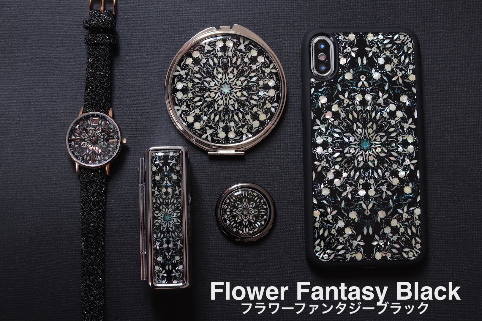 ④フラワーファンタジーブラックセット 64,040円→42,000円(約 35%OFF) フラワーファンタジーブラックデザイン 腕時計・スマホケース・スマホリング・コンパクトミラー・リップケースのセットです。