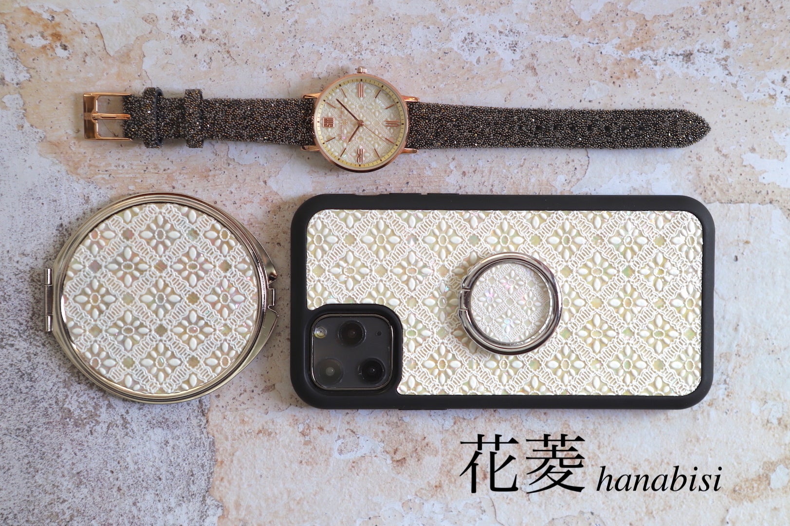 ③花菱セット 60,960円→39,000円(約36%OFF) 花菱デザイン 腕時計・スマホケース・スマホリング・コンパクトミラーのセットです。