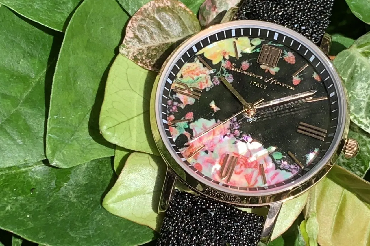 この螺鈿アート「薔薇と果実に誘われて」を文字盤に採用した腕時計をリターンに追加登録させて頂きました。