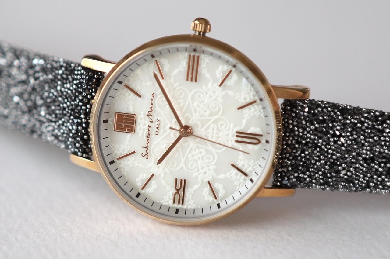 レディースウォッチとしては少し大きめのボーイズサイズ(ケース径34mm)の文字盤に映える螺鈿アート、スワロフスキー®︎クリスタルをふんだんにあしらったストラップとの組み合わせは腕元に確かな個性を示します、パーティドレスやカジュアルスタイルでのコーディネイトが楽しくなるアイテムです。また付属のメタルメッシュベルトに付け替えることでスーツスタイルとの親和性も高まります。