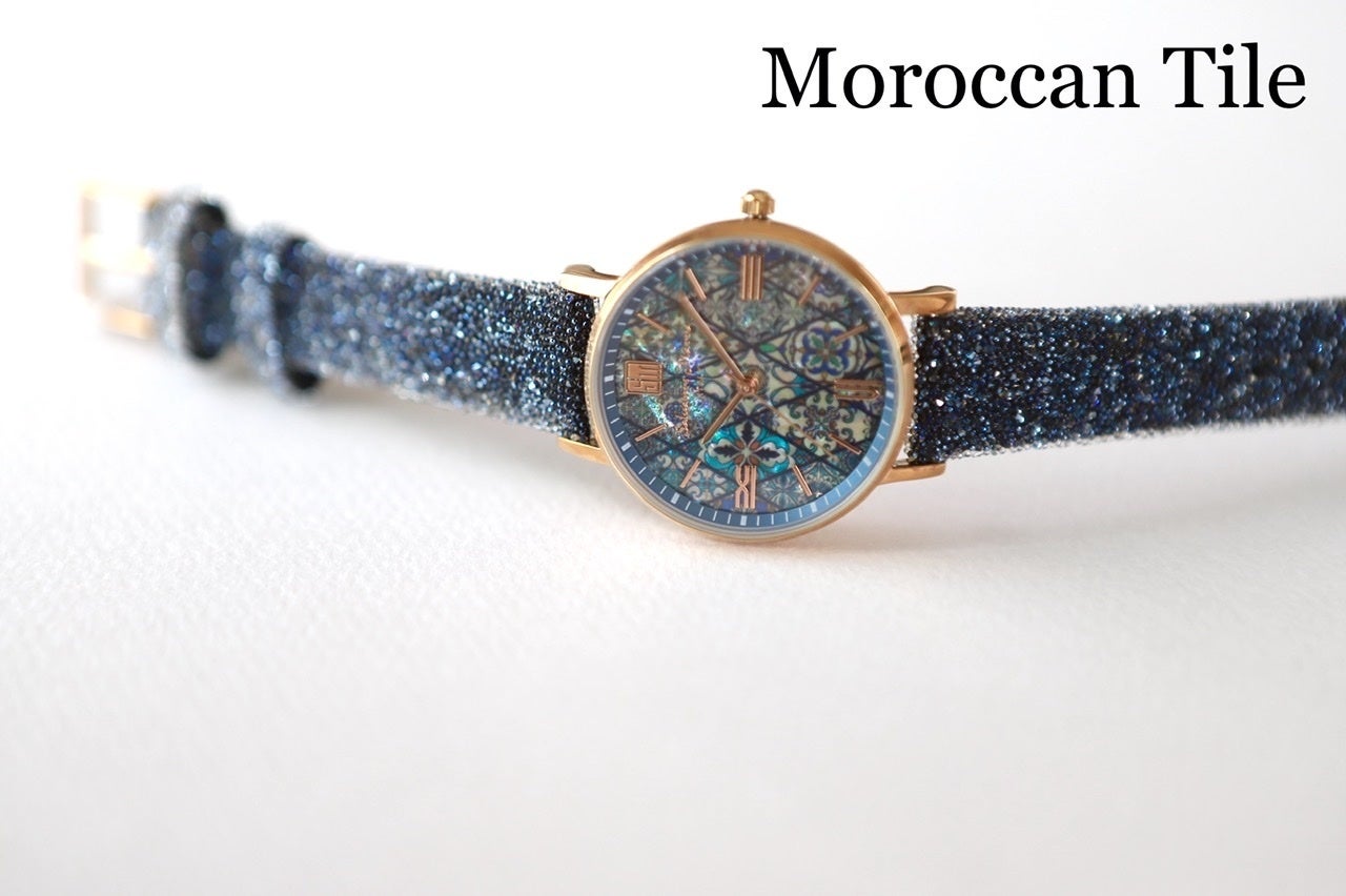 こんな美しい町並みをキラキラの貝殻文字盤に閉じ込めてみようと出来上がったのが、このモロッコタイルのデザインです。