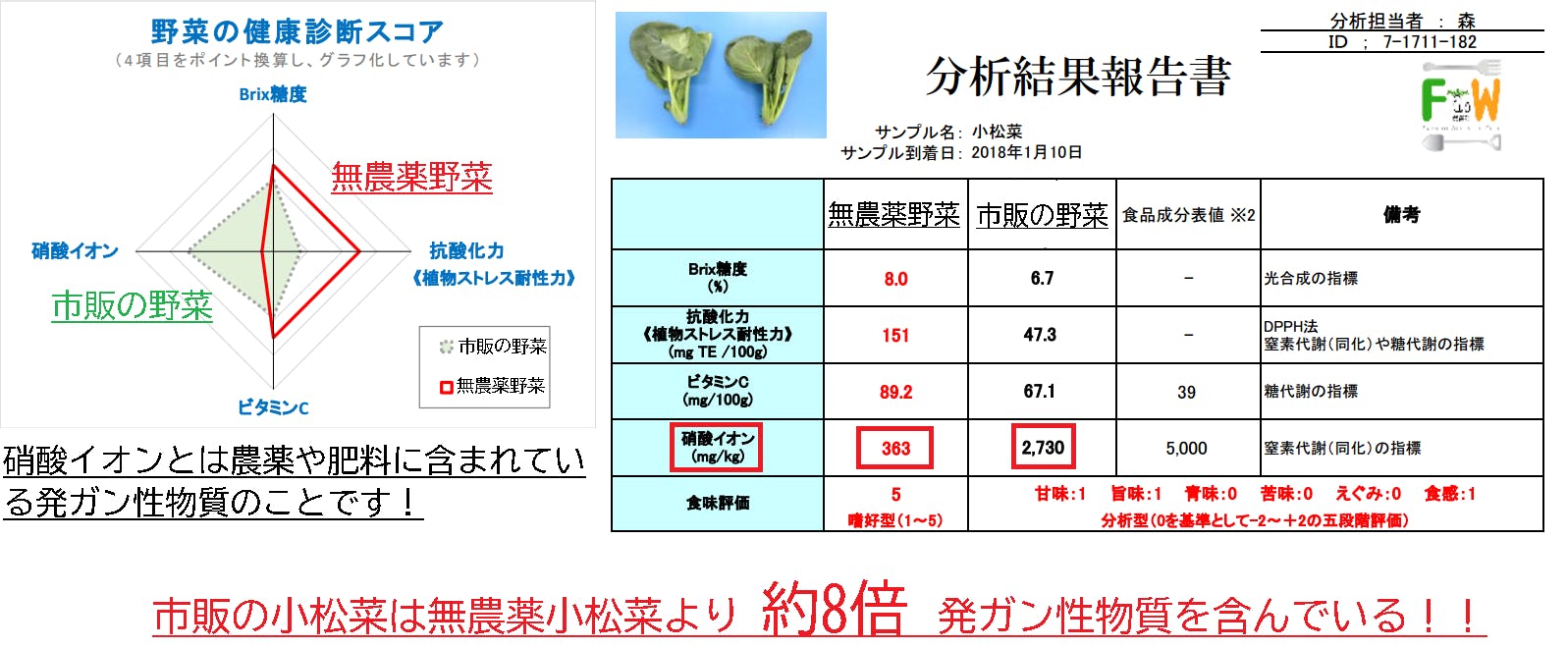 その農薬や肥料に含まれる「硝酸イオン」という成分が人体に入ると発ガン性物質になったり、血中の酸素を減らしたりと人体に非常によくない影響をもたらしています。