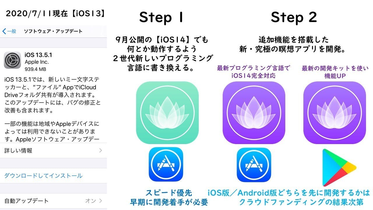 今回「究極の瞑想」アプリ存続のニーズがどれぐらいあるかを計測できて、充分なニーズがあった場合に9月のiOS14公開に間に合うように開発ができ(ステップ1)、 続けてニーズの高い機能を実装して大幅リニューアル(ステップ2)ができるよう、こちらCAMPFIREの「クラウドファンディング」の形で開発資金を募らせて頂くことにしました。