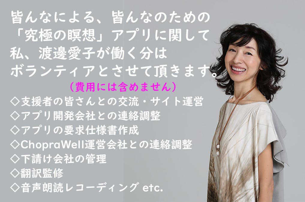2020/09/26 07:00[2020/9/23 21:14配信]「コロナ渦で存続危機にある「究極の瞑想」アプリを皆で企画開発し、育てていきたい!」プロジェクトオーナーの渡邊愛子(Body Mind Spirit Inc)です。昨晩、プロジェクト終了ギリギリでしたが目標金額を達成いたしまして皆様からご支援・ご協力を頂けたことを心より感謝しております。先程、プロジェクトサイトの「活動報告」ページに第一弾のご報告をさせて頂きました!支援総額は 2,484,057円で(うち60万円は私自身も投入)手数料(17%) 422,290円と手数料の消費税 42,229円が差し引かれ2,019,538円がアプリ開発の資本となります。当プロジェクトサイトで告知させて頂いたとおりiOS版を現状機能そのままでiOS14上でも動作するようバージョンアップ(iOS 13 [swift5] への対応)開発費が165万円(税込)かかっております。そして新Android版 支援金額が444,000円でしたので手数料(17%) を差し引いた368,520円が9/1と9/7にプロジェクトサイトで連絡させて頂いたAndroid版 存続の危機を救うために割り当てる金額となりました。2,019,538円(アプリ開発の資本)ー1,650,000円(iOS 13 [swift5] への対応)ー 368,520円(Android版を11月以降も存続させる開発費用に充当)--------------=1,018円ということで、今回皆様からの支援金は:「究極の瞑想」アプリのiOS版とAndroid版を・現機能そのままで開発プラットフォームを刷新し・不具合対応などメンテナンスの体制を用意するために充当するという結果となりました。つまり「新機能」を実装する資金は得られなかった訳ですがiOS版とAndroid版という3歳の双子の命が皆様の手によって救われましたので、「究極の瞑想」アプリユーザーの皆さんとのコミュニケーションサイトを用意し、「皆による、皆のための、最高な瞑想アプリ」であるよう改めて必要支援を募ったり、引き続き盛り上げていきたいと思います。10月から新たに始めるYouTubeの「渡邊愛子の瞑想エンタメちゃんねる」でもフィーチャーしていきますね!そして、今回頂いた・音声や映像コンテンツ追加機能実装の支援者 9名・チョプラ氏の「究極の眠り」追加の支援者 12名・チョプラ氏の音声・映像コンテンツ追加の支援者 7名・ご希望の機能1点リクエストの支援者 21名の方々からのご支援・ご希望も、究極の瞑想アプリの将来の発展に引き継がせて頂きます。「234万円を達成できた時点」でお送りするとお約束した下記の音声ファイルは明日、このCAMPFIREのメール連絡機能を使ってダウンロード用のリンクをお送り致しますね!本当にありがとうございました。渡邊愛子~☆~☆~☆~☆~「究極の瞑想」アプリ人気の課金コンテンツより:【瞑想する】・瞑想前にすると良いこと・3つの質問 ※・4つの質問 ※・瞑想誘導・20分間の無音~チャイム音・意識を深めるスートラ【瞑想オプション】・10分間の無音~チャイム音・30分間の無音~チャイム音【曜日別 願望実現スートラ】・日 Aham Brahmasmi・月 Tat Tvam Asi・火 Sat Chit Ananda・水 San Kalpa・木 Moksha・金 Shiva-Shakti・土 Ritam もっと見る