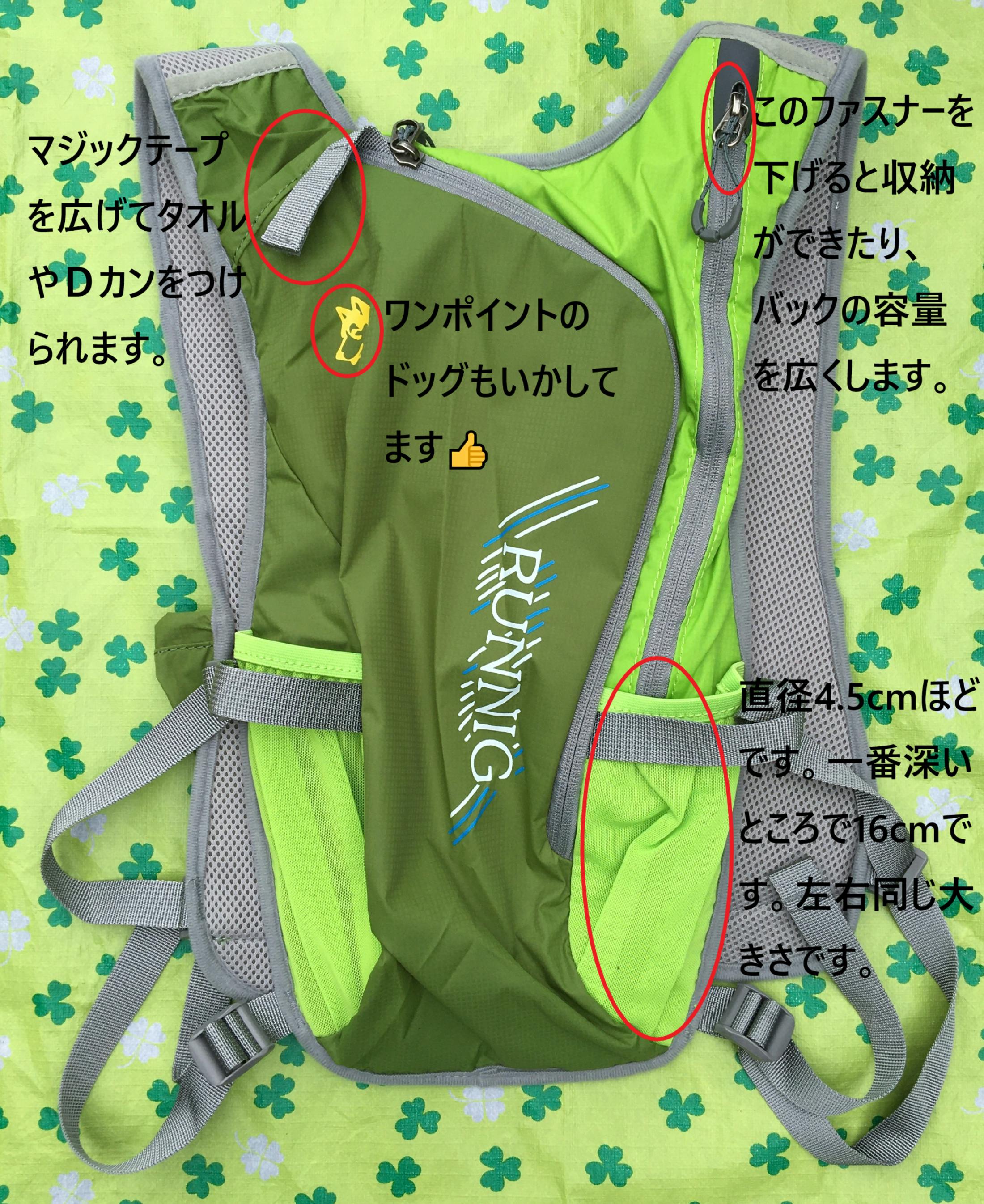 ・前側左右に500mlペットボトルが収納できるポケットがあります。すぐに手が届くところに飲み物があるのはいいですよね!直径約6.5cm,深さ14cmです。