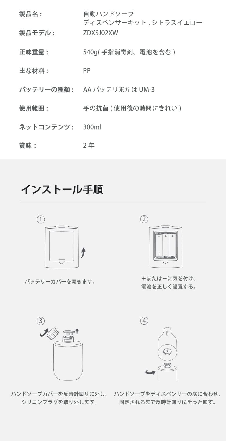 6 初めて使用する場合、バッテリーと手指消毒剤を取り付けた後、センサーが4回トリガーされた後に正常に泡立ち手洗いすることができます。