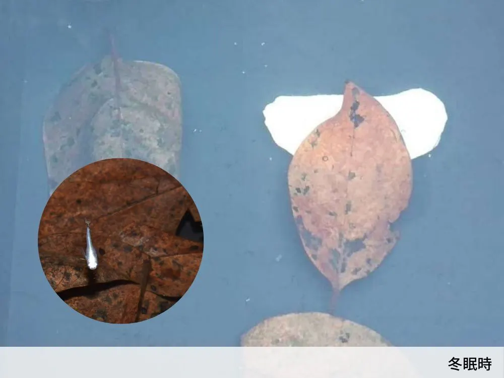 冬場水槽に投入する柿の葉の下にメダカは隠れます。