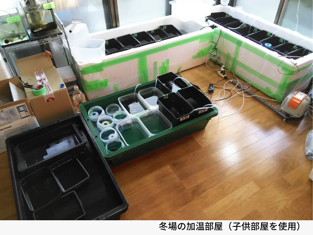 現状冬の間は長男の子供部屋を借りメダカ繫殖部屋を作り加温ヒーターを使用し冬の採卵をごく小規模ですがおこなっています。