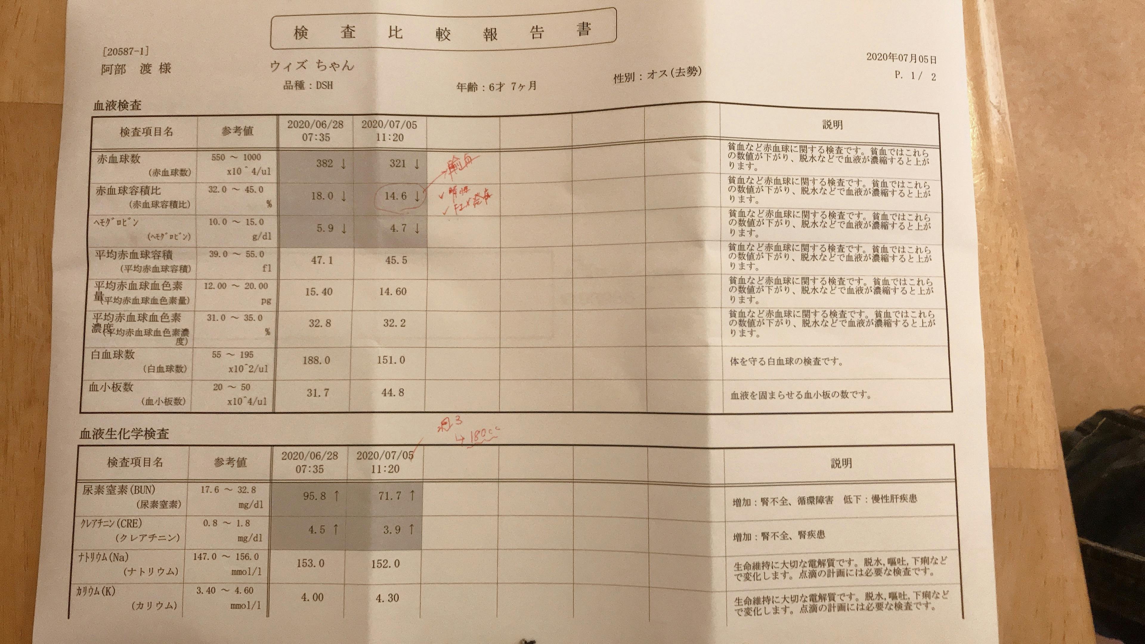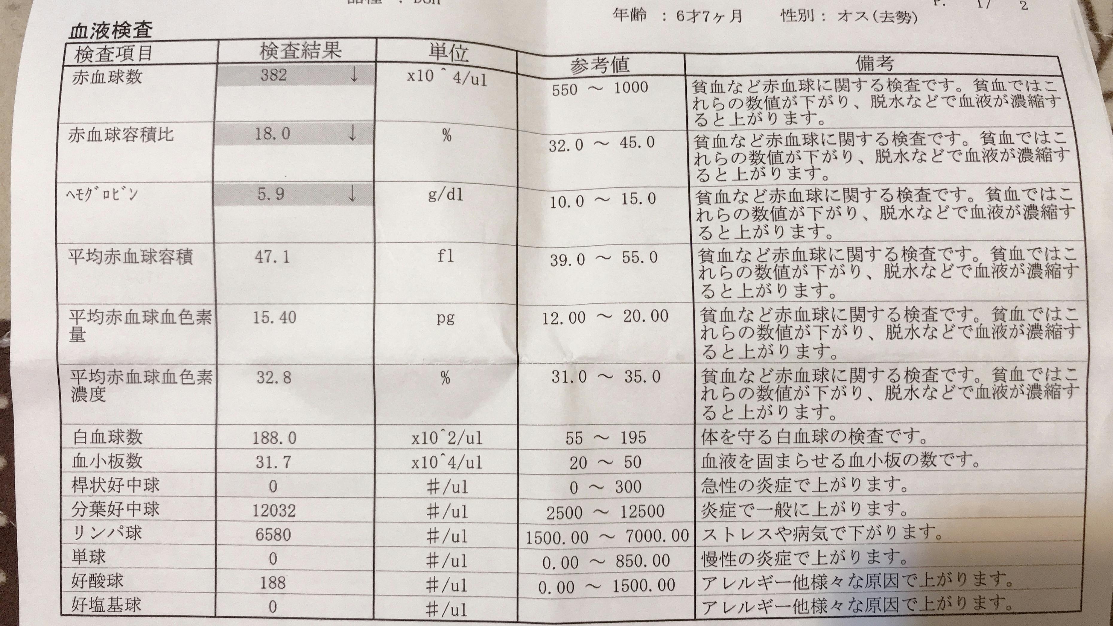 そこで皮下点滴、抗生物質の投与をして下がるのを待ちましょうとのことでしたが、一週間後の血液検査では腎臓の数値はややよくなったのですが、赤血球がさらに下がってしまい増血剤や輸血をしなければならないくらい低くなってしまいました。