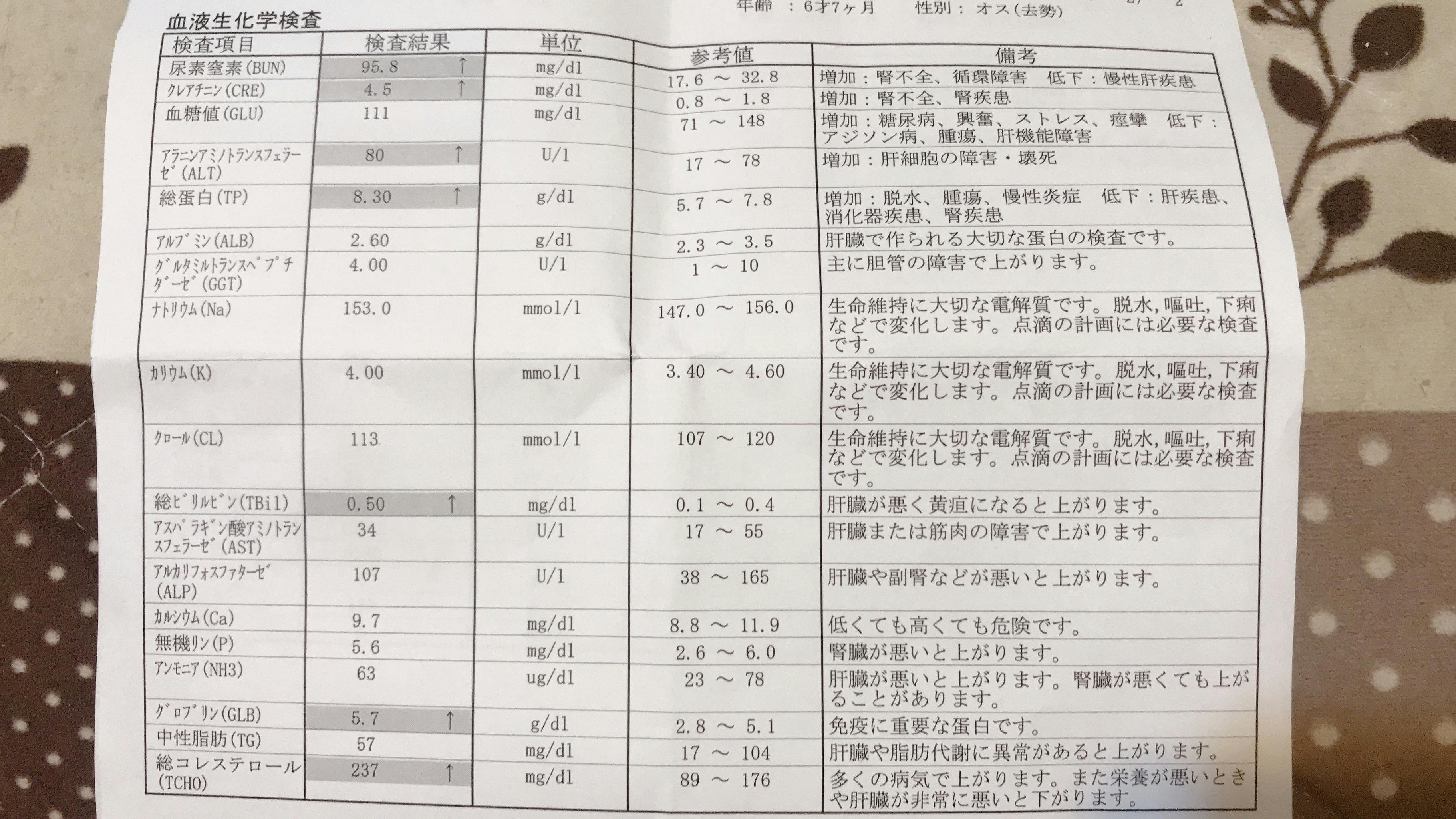 原因は分からず、血液検査の結果としては、腎不全になりかかっている、赤血球が低くて貧血状態になっているとのことでした。