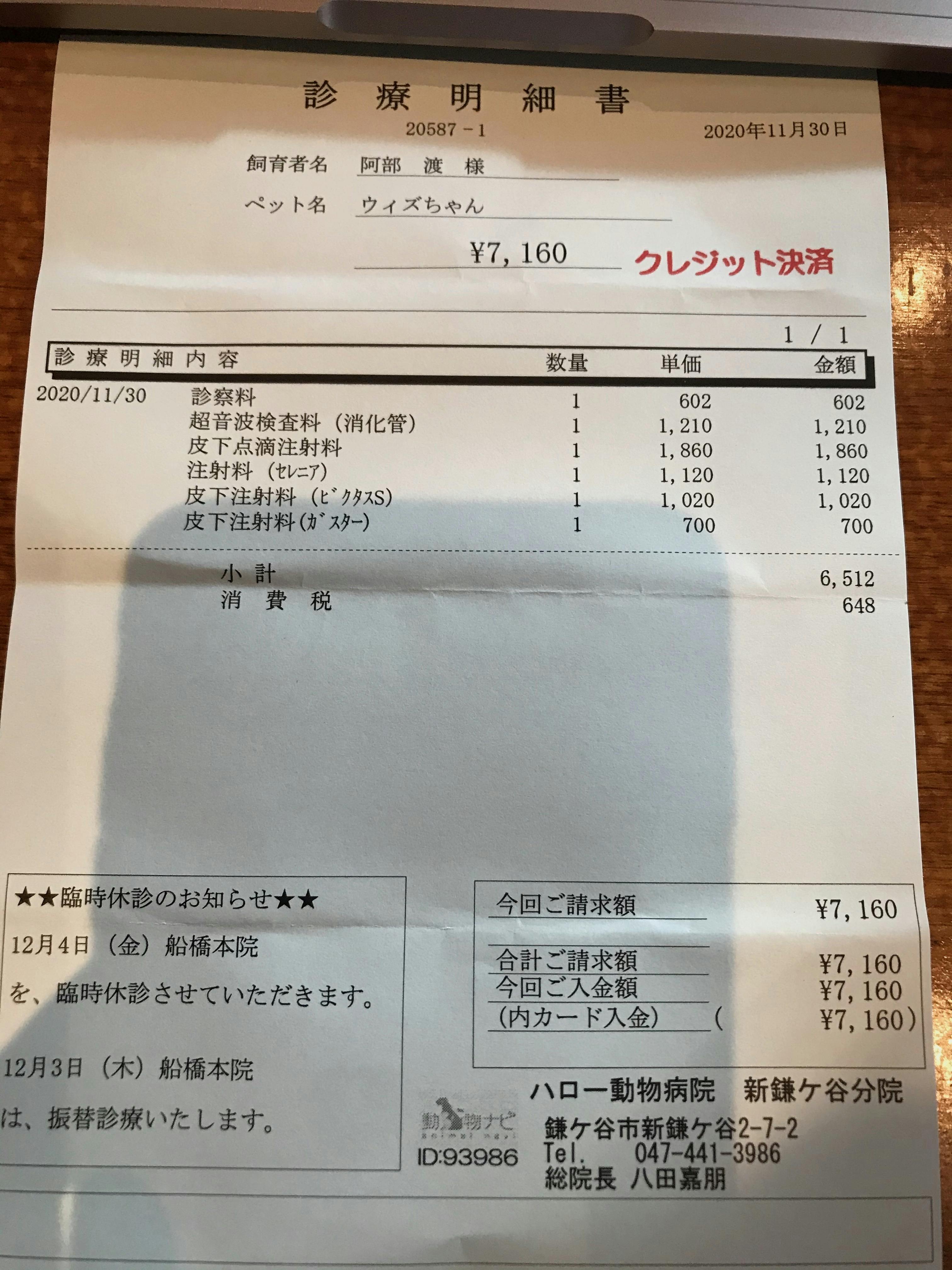 ①毎週の血液検査で17000円ほどかかります。(内視鏡検査実施まで)(クレジット決済となっていますがVISAデビットカードです)