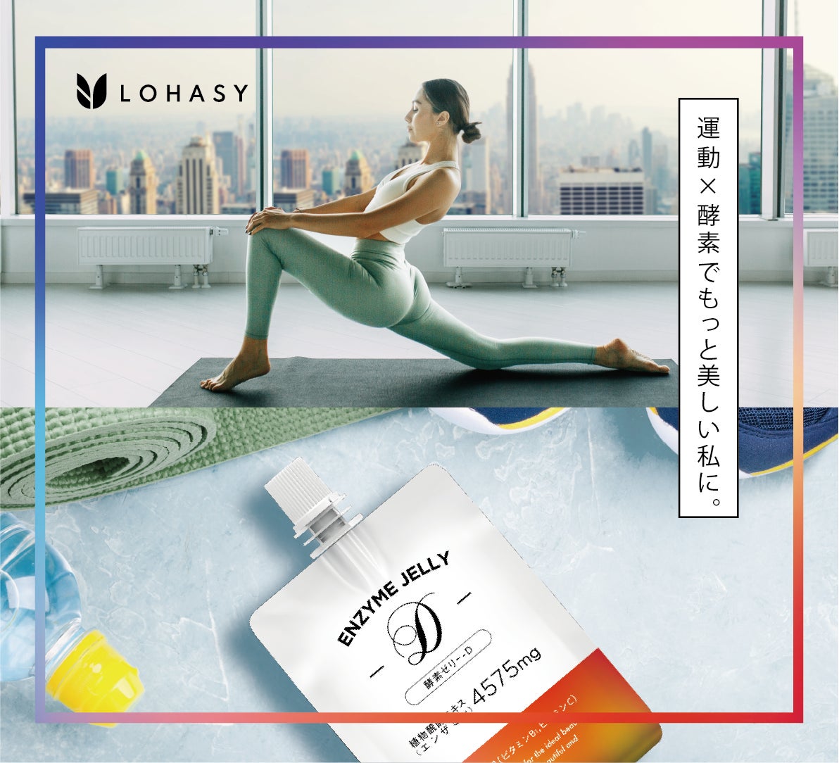 運動前にすっと飲んで、体内の酵素の働きをサポートする栄養を摂取できる 「ENZYME JELLY D」(酵素ゼリーD) は、体を内側からキレイにするYOGAとの相性も抜群 です。