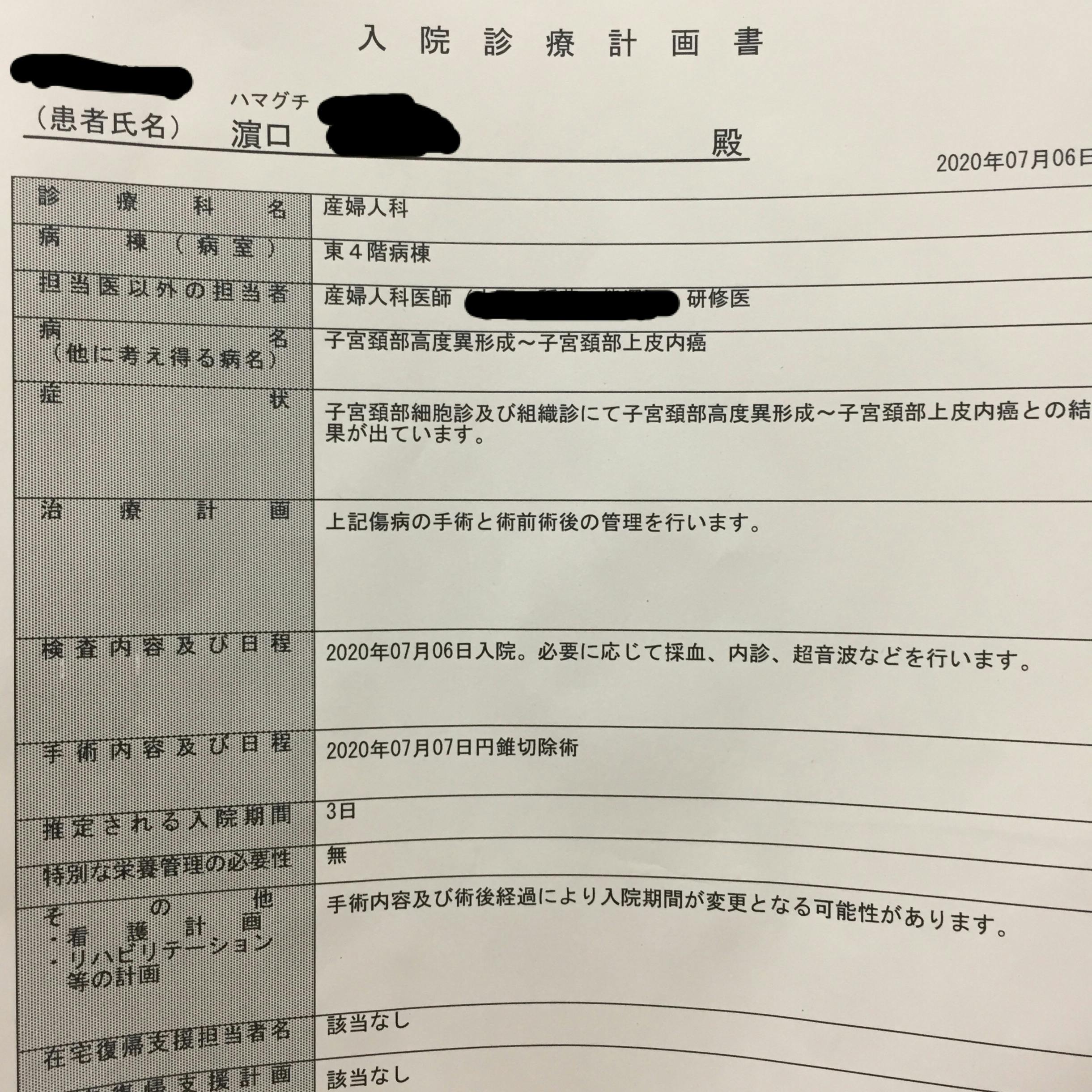 私は子宮頚がんのステージ0で、つい先日(7/7)に円錐切除術という手術を受けてきました。