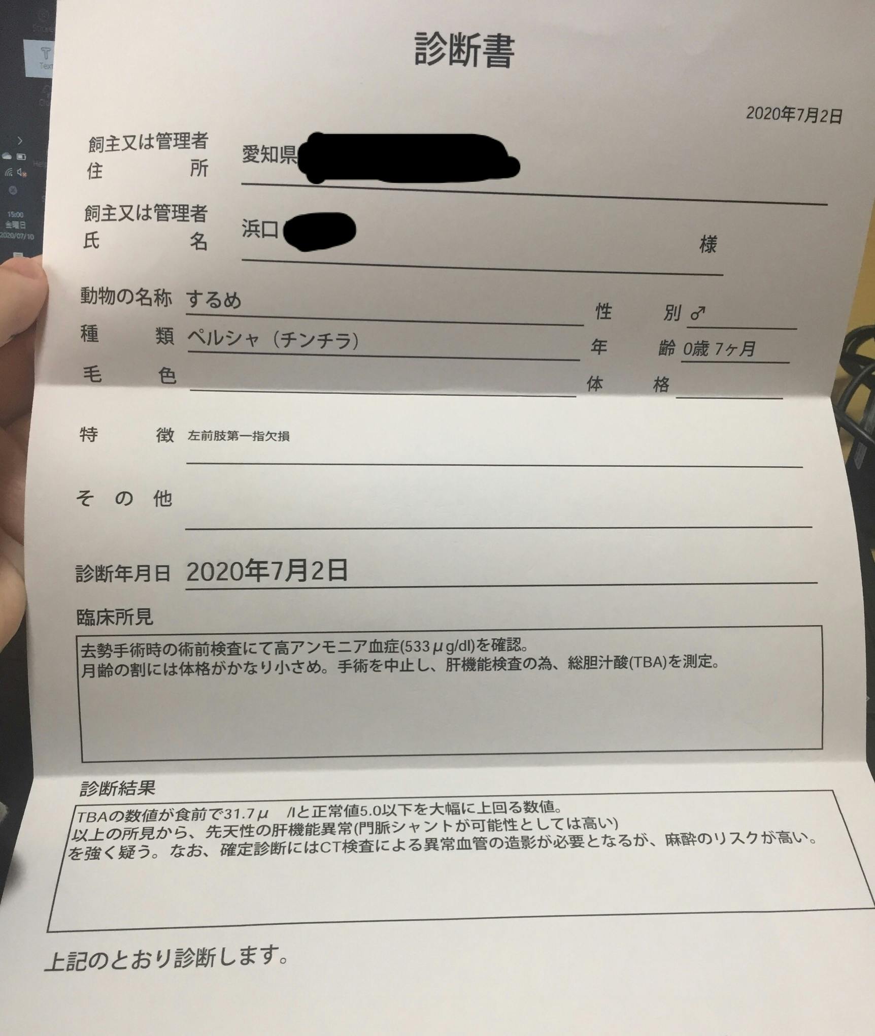 病気が判明した経緯は6/28に受けた去勢手術の術前検査です。この検査でアンモニアの数値が基準値の23~78をはるかに超えた533という結果が出てしまいました。