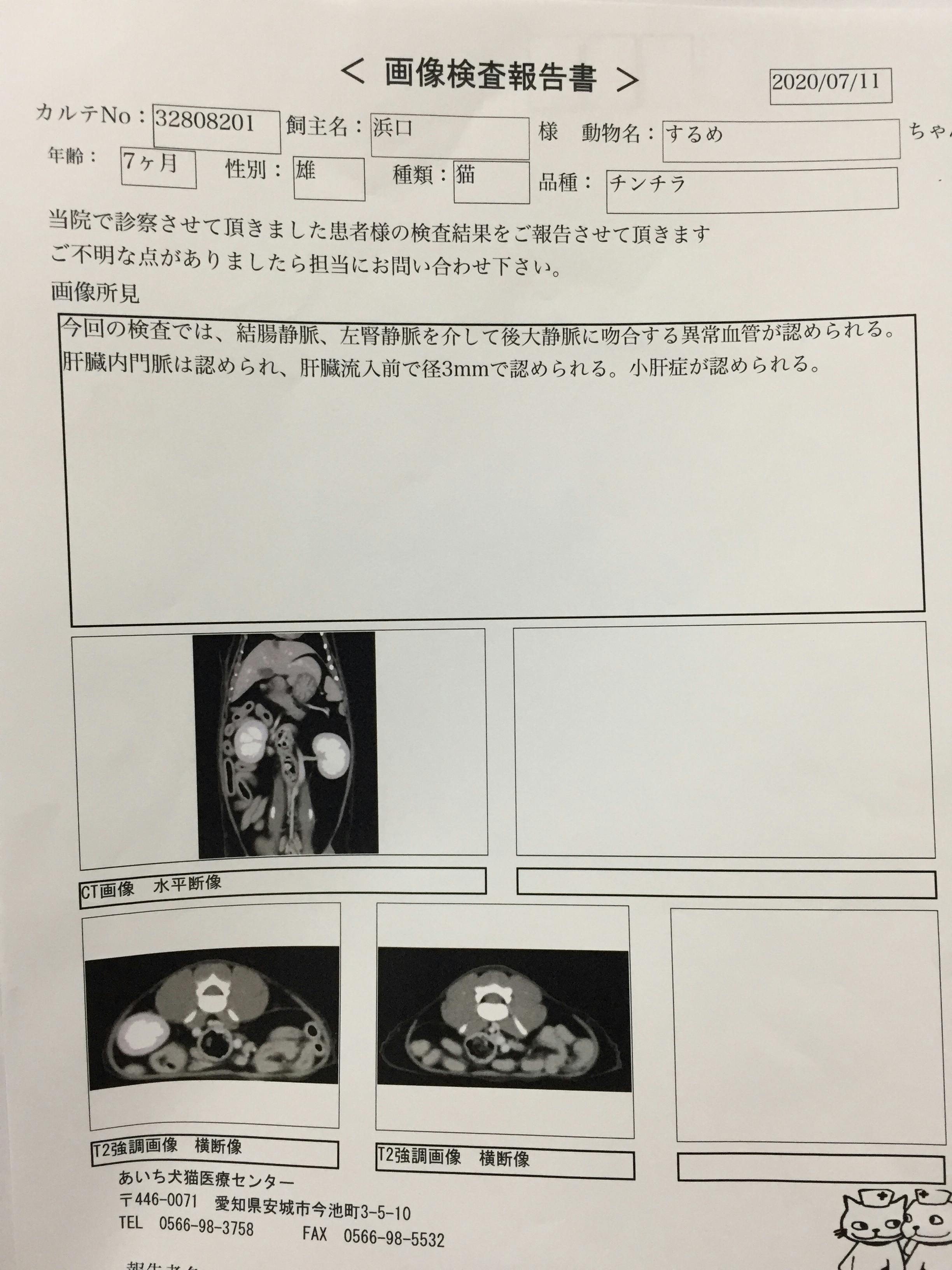 7/11に設備の整った動物病院にてCT検査を受診したところ、手術可能の状態であると説明を受けました。