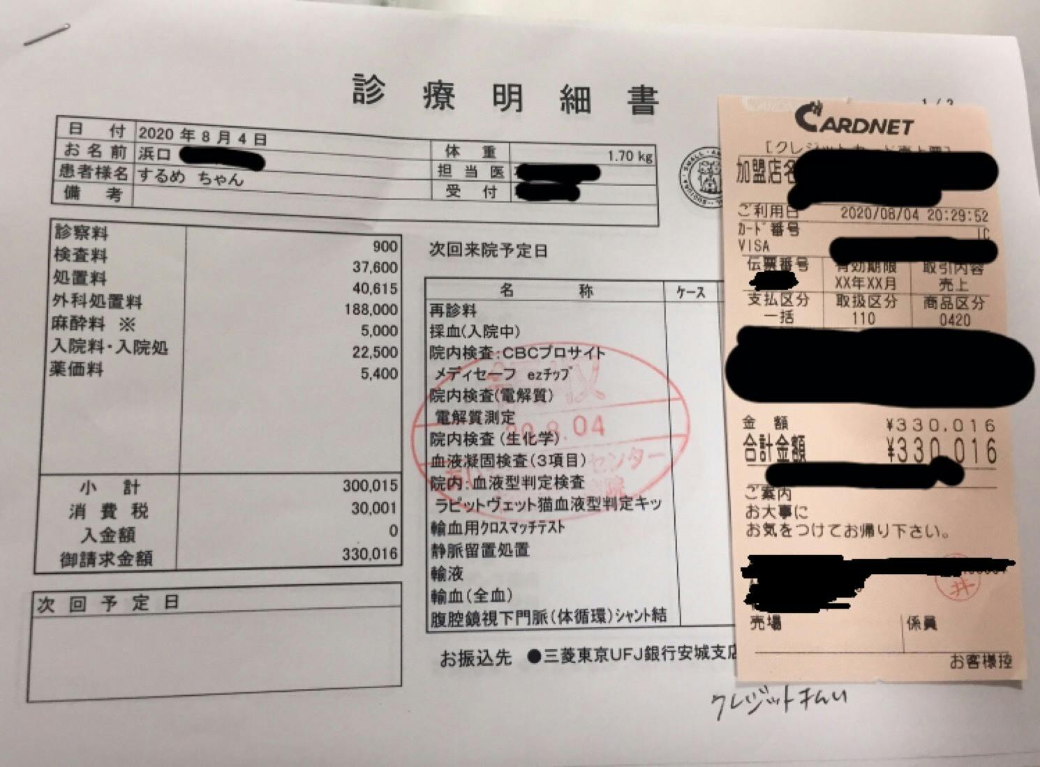 治療には手術が必要であり、1回の手術費だけでおよそ35万円ほどかかる予定です。(状態によっては2回手術することが多いそうです。)