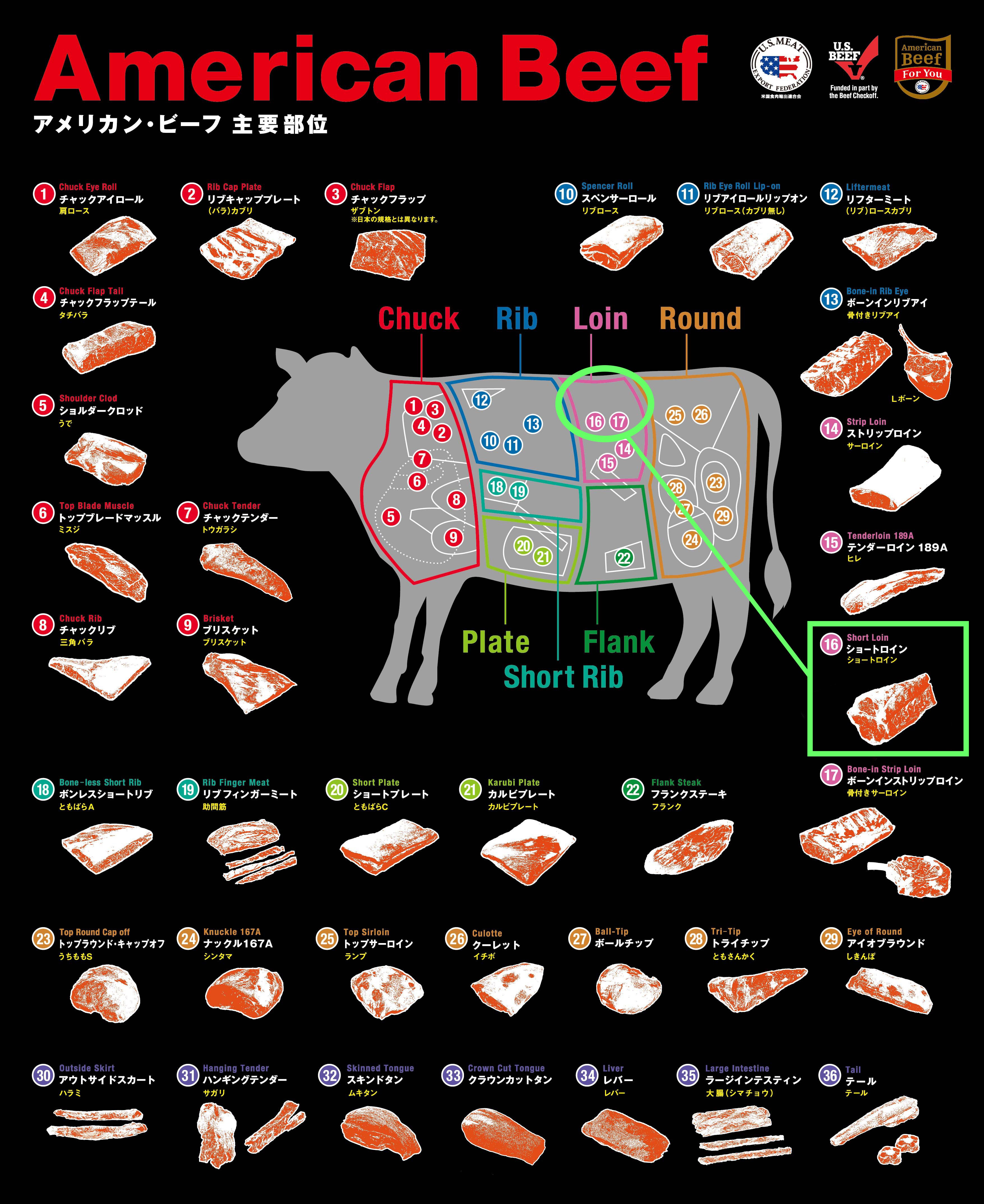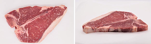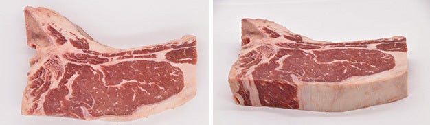 この2つの部位は元々ショートロインという、背中から腰にかけての部分の総称で、同じブロックのお肉です。ヒレはサーロインよりもサイズが小さく短いため、ショートロインからTボーンが取れるのは約半分、残りの約半分はLボーンとなります。Tボーンだけを販売するとLボーンが余ってしまうため、基本的にセットでの販売となるのです。