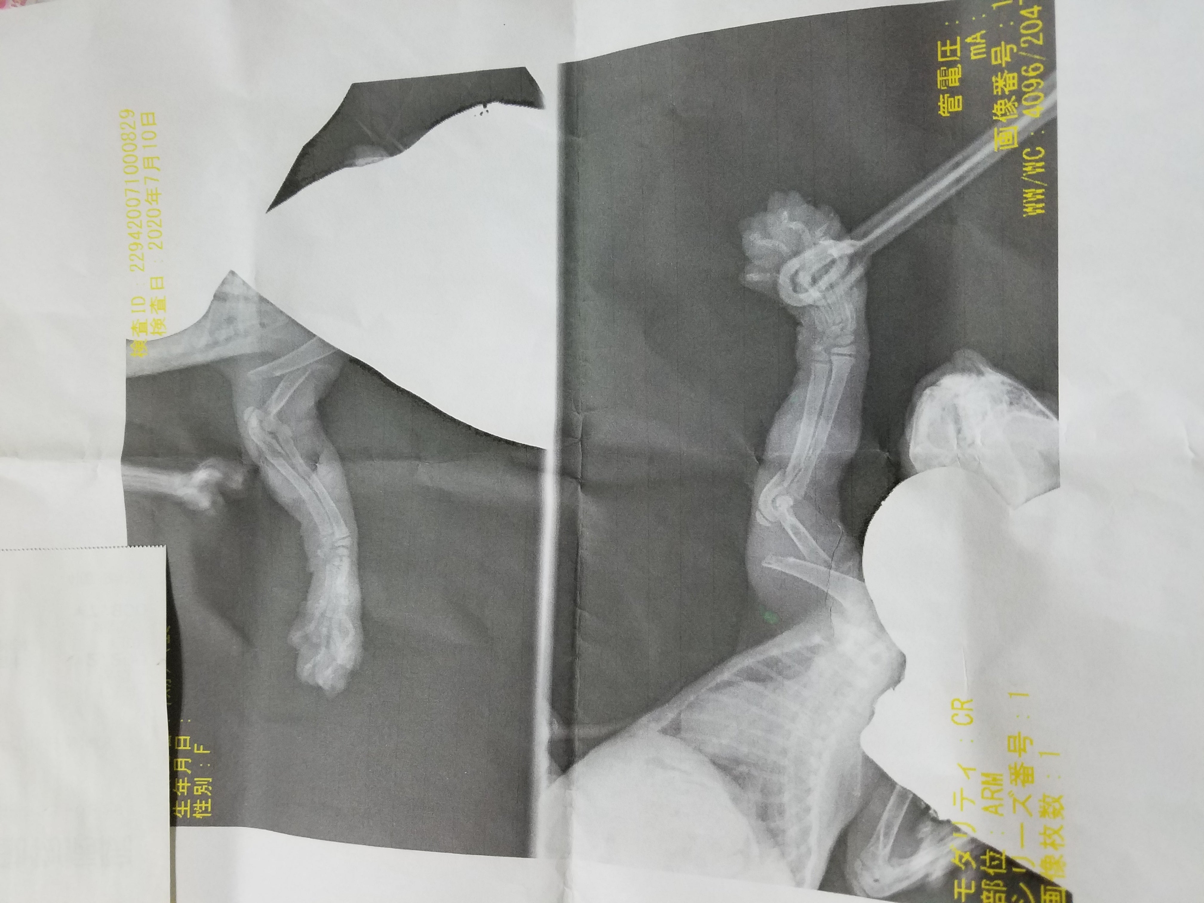 虐待を受け心身共に傷ついたセンちゃんの左前脚は6箇所の骨折と重度