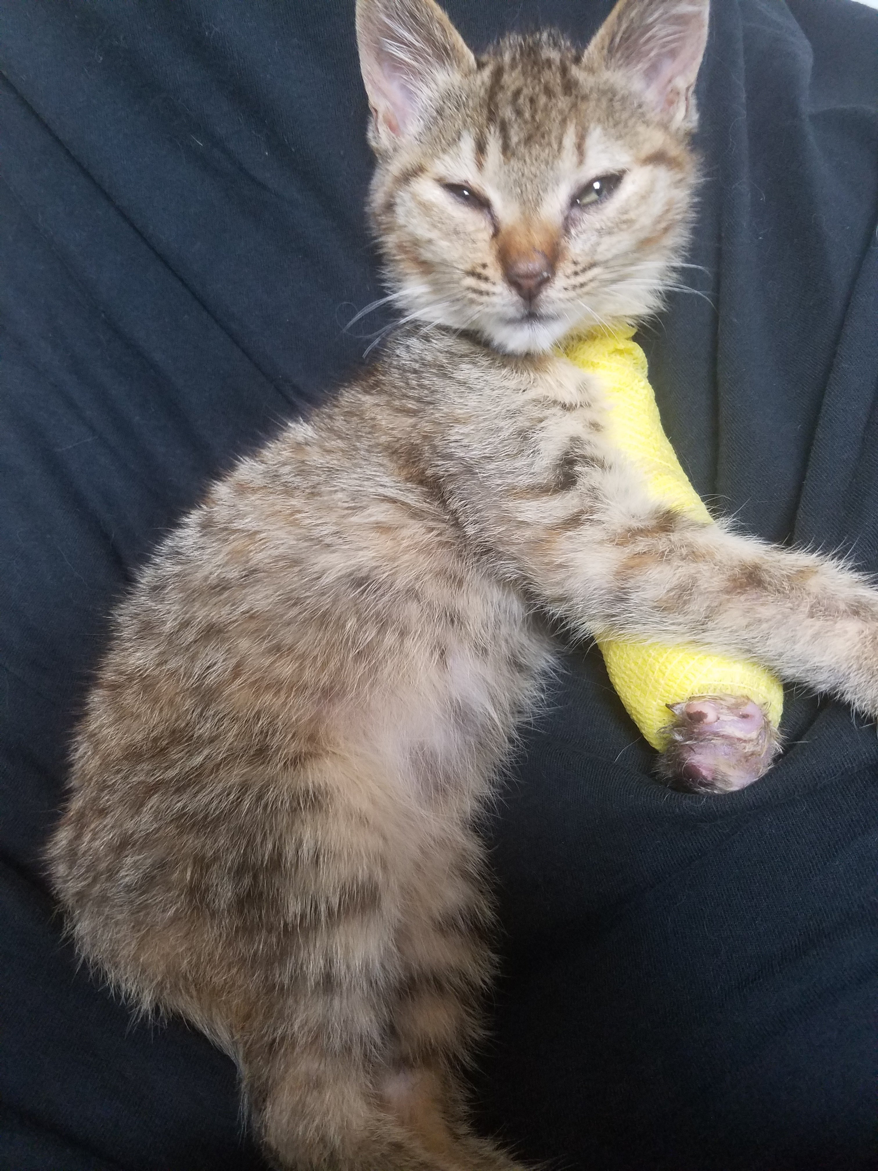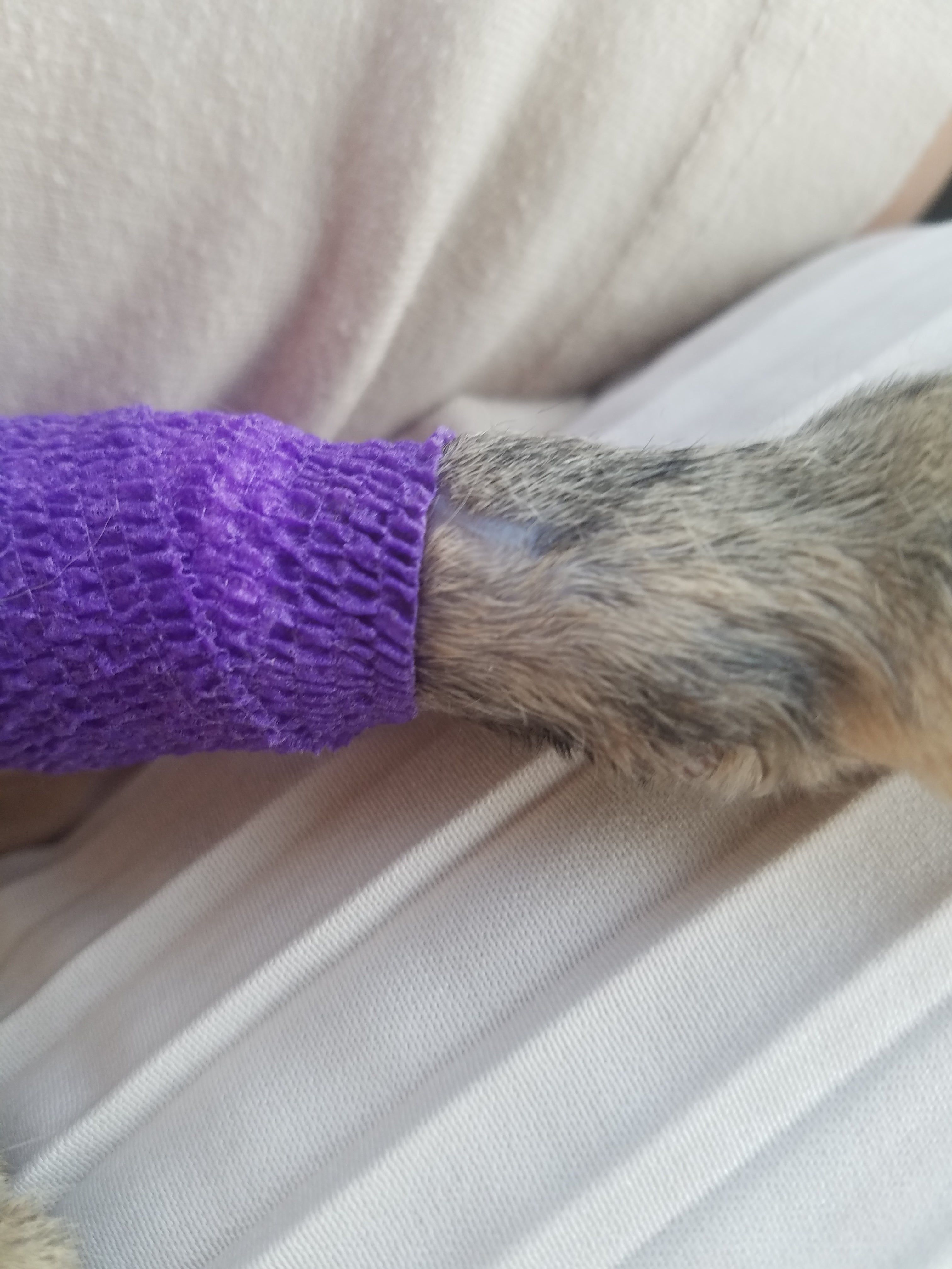 保護した当初6箇所の骨折と、鋭利なもので切られた裂傷があり、手先まで腫れていて包帯も手の先まで巻かれておりましたが、本日獣医師の判断により傷口が塞がったとして裂傷部分の包帯を外すことが出来ました。