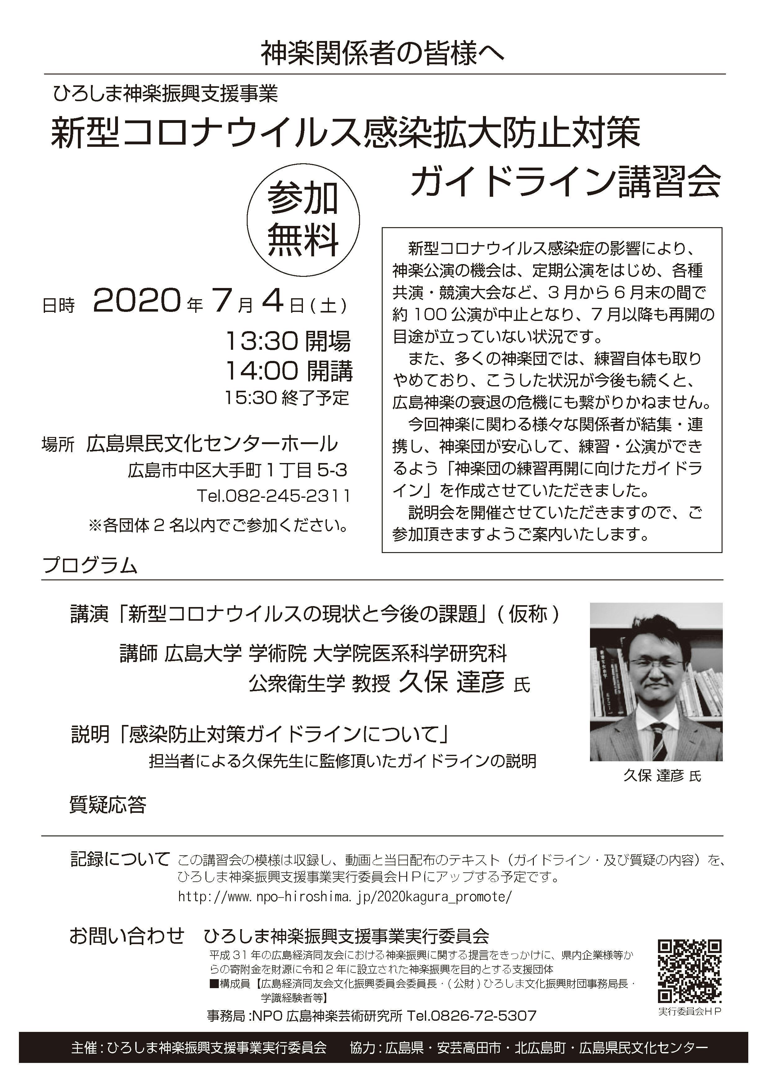7月4日(土)には 、神楽に関わる様々な関係者が結集・連携し、神楽団が安心して公演が再開できるよう、広島県民文化センターを会場に「新型コロナウイルス感染拡大防止対策ガイドライン講習会」を開催し、「神楽団の練習再開に向けたガイドライン」を説明させて頂きました。