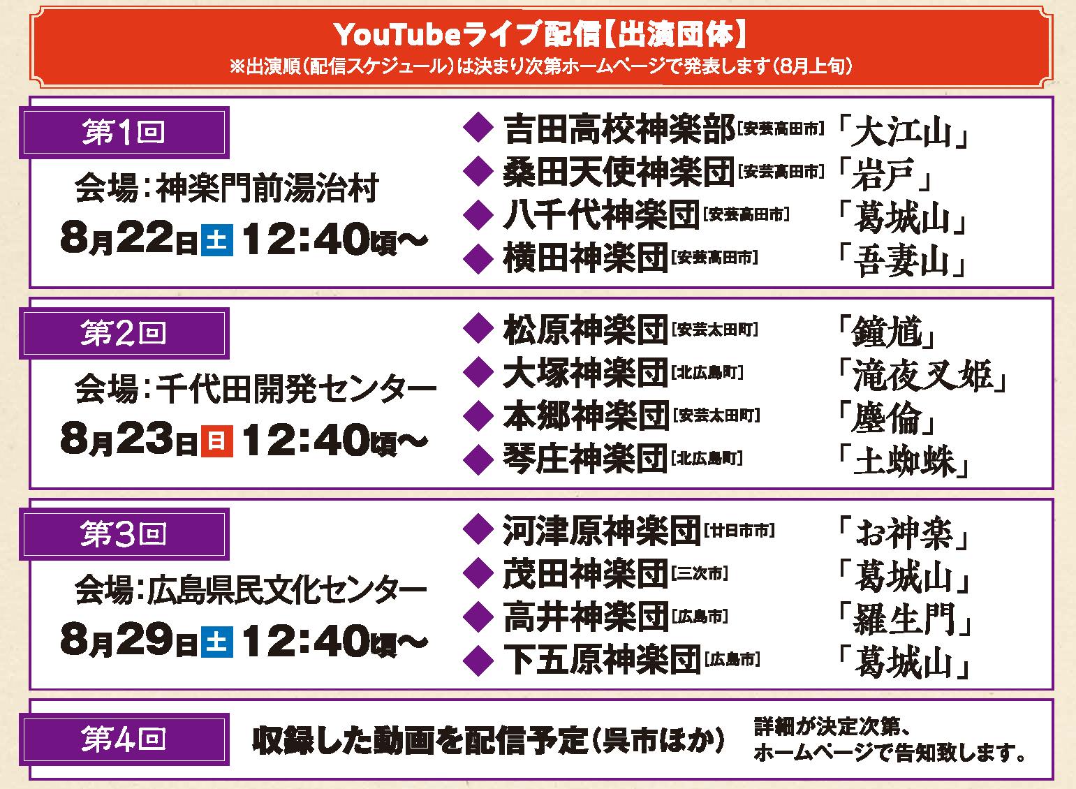 2020/08/26 19:348月29日(土)13:00~広島県民文化センターよりYouTubeで神楽のライブ配信を実施します。センターカメラ映像▼RCCBC神楽チャンネルhttps://www.youtube.com/channel/UCAc7NHicLPQ2posHLRXJfcg▼サブカメラ映像NPO広島神楽芸術研究所チャンネルhttps://www.youtube.com/user/npokagura各チャンネルの登録をしてご覧ください。●配信スケジュール2020年8月29日(土)広島市中区 広島県民文化センターより※やむを得ず出演団体・演目・配信時間等が変更になる場合がございますご了承ください。①13:00~ お神楽(おかぐら)-河津原神楽団(廿日市市)②15:00~ 葛城山(かつらぎざん)-茂田神楽団(三次市)③17:00~ 羅生門(らしょうもん)-高井神楽団(広島市)④19:00~ 葛城山(かつらぎざん)-下五原神楽団(広島市)皆様のご支援により、目標額を達成することができました。本当にありがとうございます。追伸NPOの事務局のある北広島町では、稲刈りが始まっています。しかし、豊作を祝う秋まつりは、例年とは異なり、奉納神楽が無いお祭りを迎える事となりそうです。戦時中でも奉納神楽だけは続いていたそうですが・・・一日も早く今までの日常生活に戻れるよう願うばかりです。どうぞ皆様もお身体にお気を付けになってお過ごしください。 もっと見る