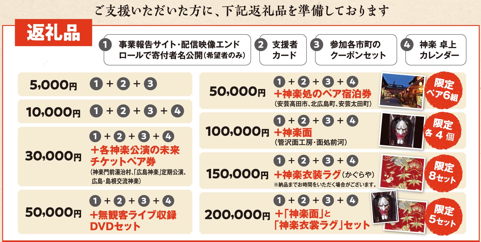 皆様から寄せられた支援金は、3月以降神楽公演が中止となり公演収入が途絶えている、神楽団のみならず、神楽を取り巻く産業-神楽公演を実施している施設やホール・関係市町の観光施設・運営するスタッフ・また、返礼品として協力頂いている 神楽の衣装や面を制作している方々などの経費に充当させて頂きます。