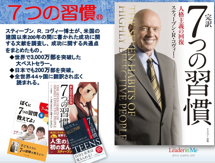 『7つの習慣®』の著者スティーブン・R・コヴィー博士と公立の小学校が共同で開発し、効果が実証された教育プログラム「リーダー・イン・ミー」を日本の公立小学校、中学校でも導入し、未来のグローバルリーダー(良き市民)を育てることを目的として一般社団法人The Global Leadership Impact Fund Japanが推進活動をしています