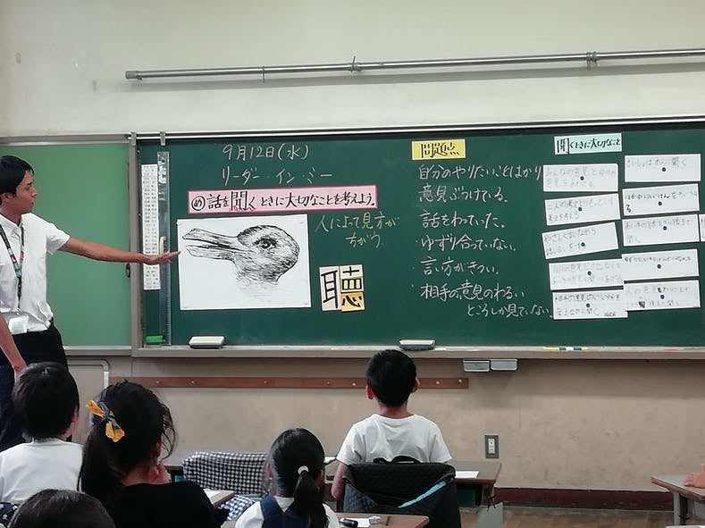 「本校は、教育目標を『やさしく かしこく たくましく』と設定して、地域住民や保護者と協働で、教育活動を推進しています。そして、子供の活躍できる場面を広げ、身に付けた基礎的な技能を活用できる喜びを味わわせることで、学習への意欲と自己肯定感を高めることを目指しています。そのためには、自分も他の人も幸せにする『リーダー・イン・ミー』の考え方で、主体的に考えたり、目的をもって行動したりする習慣を身に付けさせることが効果的です。