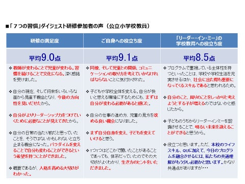 「リーダー・イン・ミー」は、単に子どもたち向けのプログラムではなく、教員、保護者の意識改革や学校の課題解決を目的として導入することで、現在のプログラムや授業をより効果的に実施できるようになります。「 リーダー・イン・ミー」によって、学業の成績への効果はもちろん、学校規律の改善、非行の減少、教職員のモチベーション向上や保護者の積極的な関与などさまざまな成果があります。