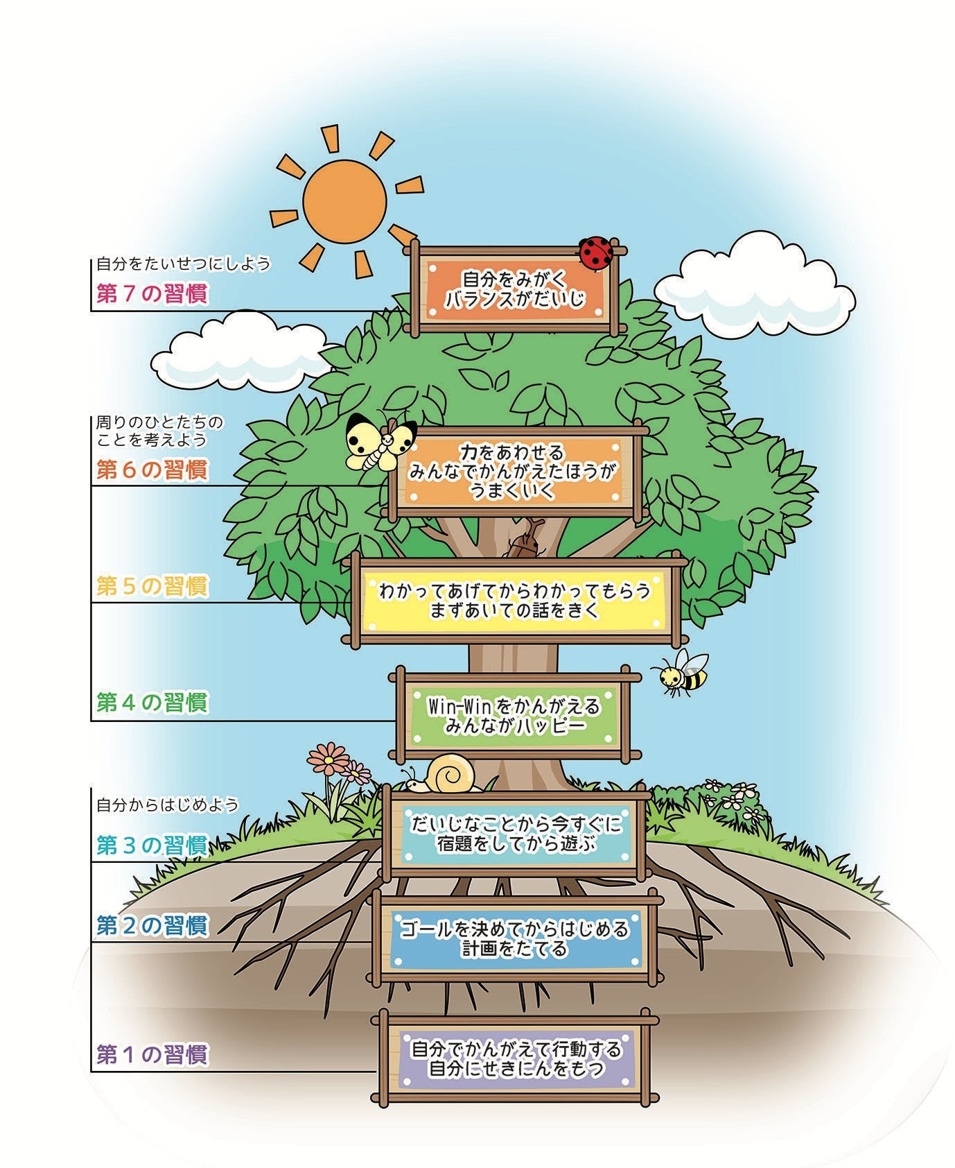 「リーダー・イン・ミー」とは、世界中の企業、行政機関、教育機関などで人材育成、組織活性化、組織文化改革のために研修で活用されている書籍『7つの習慣®』をベースとした学校文化創造プログラムです。子どもたちと教職員みんなで取り組むことで高い効果性を発揮します。