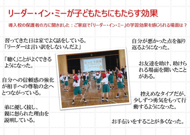 「リーダー・イン・ミー」は、単に子どもたち向けのプログラムではなく、教員、保護者の意識改革や学校の課題解決を目的として導入することで、現在のプログラムや授業をより効果的に実施できるようになります。「 リーダー・イン・ミー」によって、学業の成績への効果はもちろん、学校規律の改善、非行の減少、教職員のモチベーション向上や保護者の積極的な関与などさまざまな成果があります。