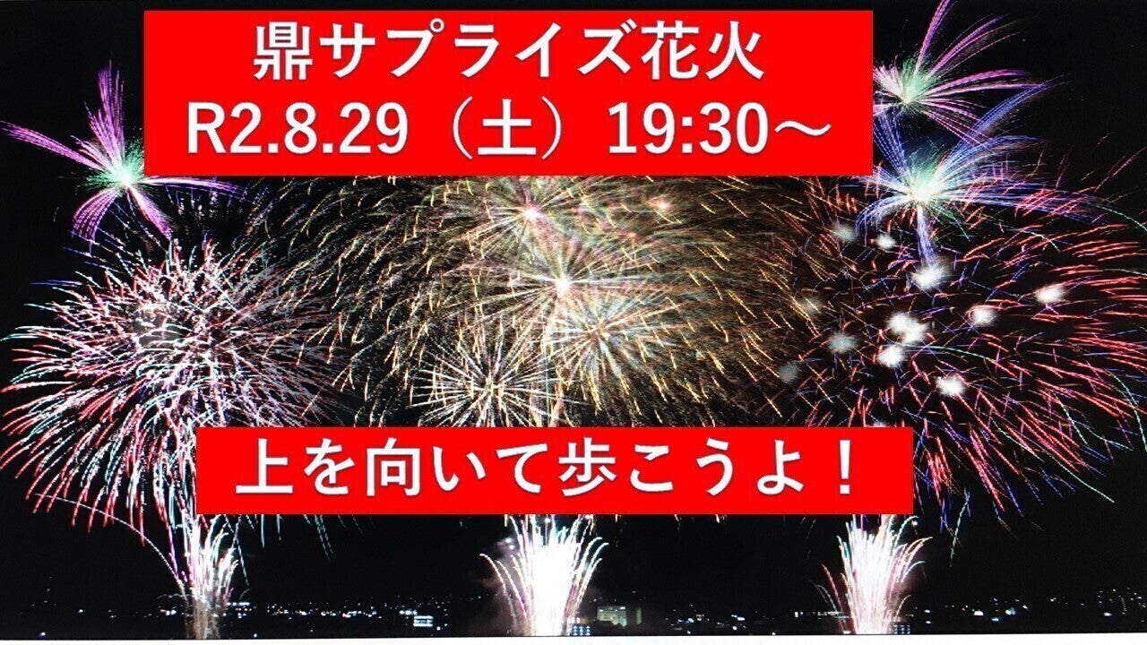 新型コロナウイルス禍の影響から、多くのイベントや地域活動が中止になっています。そのような状況ではありますが、鼎地域の夏の夜空に花火を打ち上げ、今後に向けて、地域に元気を取り戻したいと考えます。打ち上げ場所は安全上の配慮から近隣住民の皆様には通知されますが、基本的にサプライズ花火となり、3密を避ける為、それぞれの自宅で鑑賞いただくよう通知致します。花火の打ち上げにより、コロナ禍において活躍された医療・福祉従事者の皆様や洪水災害のレスキュー等で活躍された皆様への感謝の意を表すると共に、「コロナ収束への祈り」をこめて、地域の皆様と花火打ち上げの時間を共有することで、子供さんからお年寄りまで記憶に残る夏になればと思います。