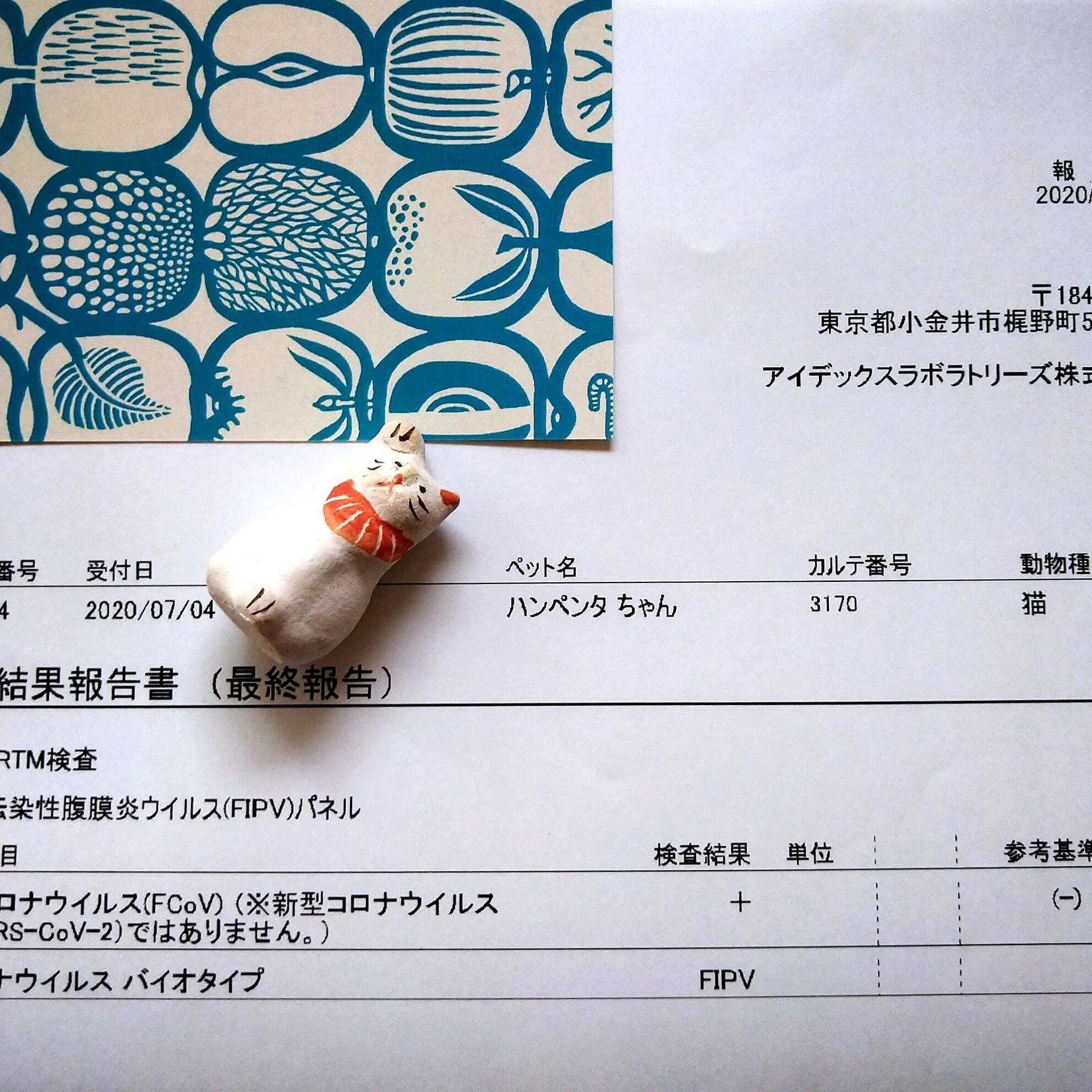 しかし、そこで血液検査をした結果、FIP(猫伝染性腹膜炎)という、致死率は ほぼ100%だといわれているとても厳しい病気の疑いが告げられました。かかりつけの獣医さんにも、セカンドオピニオンの獣医さんにもこの病気であれば不治の病だと告げられ、はんぺん太が痛みに耐えて抜いた胸水を東京のPCR遺伝子検査に出しました。