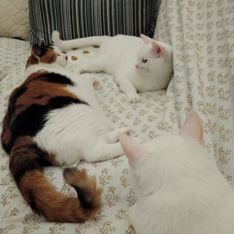 はんぺん太(いちばん奥)と、三毛猫まぁちゃん、白猫くうちゃん